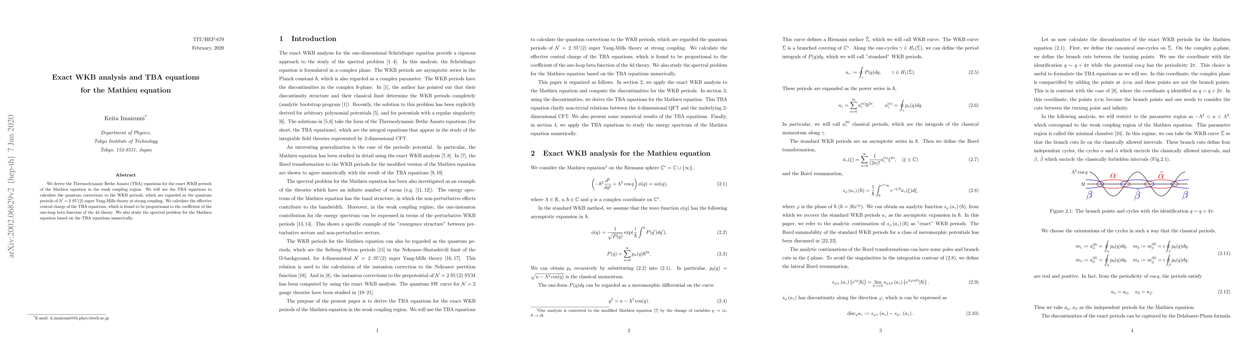 This paper derives the Thermodynamic Bethe Ansatz (TBA) equations for the exact WKB periods of the Mathieu equation in the weak coupling region, using them to calculate quantum corrections to these periods. It finds the effective central charge of the TBA equations proportional to the one-loop beta function coefficient of the 4d theory and studies the spectral problem numerically.