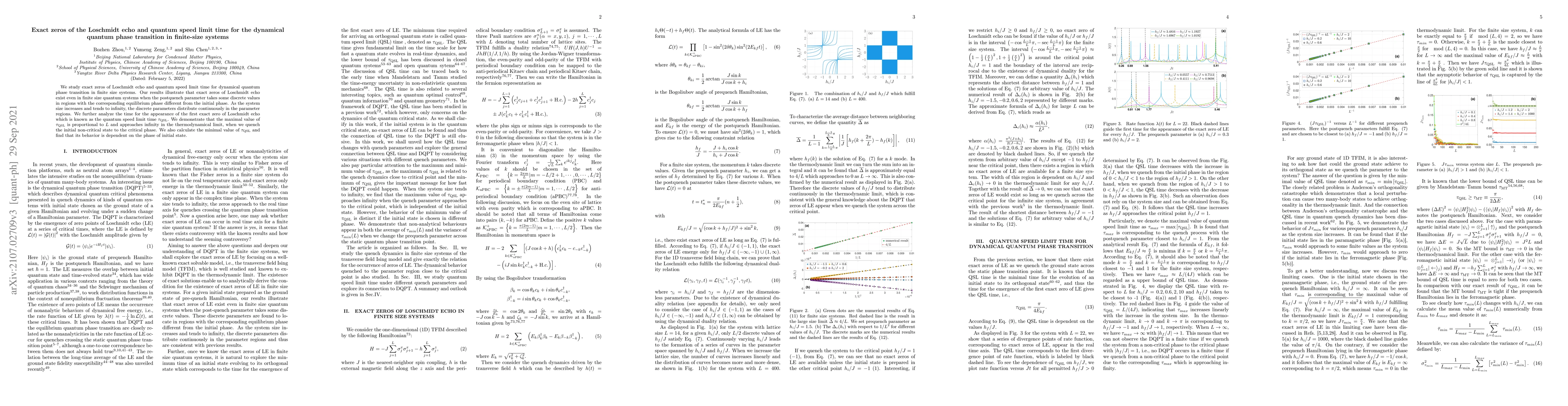 This paper investigates the exact zeros of the Loschmidt echo and the quantum speed limit time for dynamical quantum phase transitions in finite-size systems. It finds that exact zeros exist for discrete postquench parameters in different equilibrium phases, and as the system size increases, these parameters become continuous. The study also reveals that the maximal quantum speed limit time scales with the system size and diverges in the thermodynamic limit when transitioning from a non-critical to a critical phase.