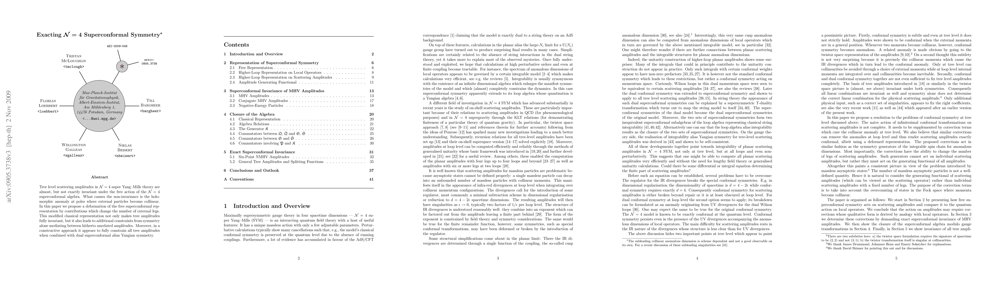 Tree level scattering amplitudes in N=4 super Yang-Mills theory are almost, but not exactly invariant under the free action of the N=4 superconformal algebra. What causes the non-invariance is the holomorphic anomaly at poles where external particles become collinear. In this paper we propose a deformation of the free superconformal representation by contributions which change the number of external legs. This modified classical representation not only makes tree amplitudes fully invariant, but it also leads to additional constraints from symmetry alone mediating between hitherto unrelated amplitudes. Moreover, in a constructive approach it appears to fully constrain all tree amplitudes when combined with dual superconformal alias Yangian symmetry.