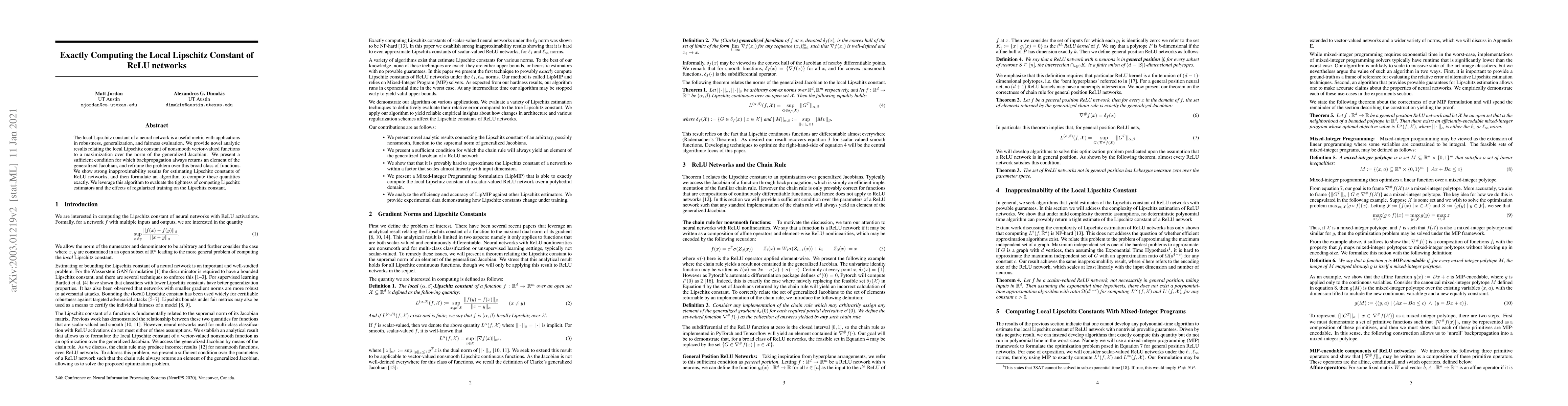 This paper develops novel analytic methods to compute the exact local Lipschitz constant of ReLU networks, providing a sufficient condition for backpropagation to return a generalized Jacobian element. It also demonstrates strong inapproximability results and evaluates the impact of regularized training on Lipschitz constants.