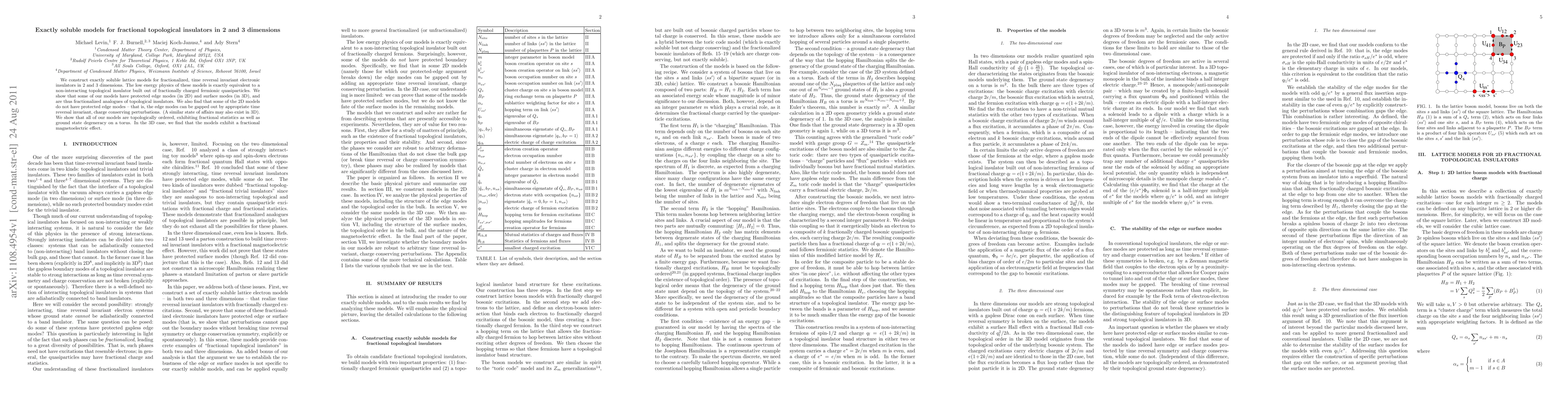 This paper constructs exactly soluble lattice models for fractional topological insulators in 2D and 3D, showing they are equivalent to non-interacting topological insulators made of fractionally charged quasiparticles. The models exhibit protected edge and surface modes, and topological order with fractional statistics and ground state degeneracy.