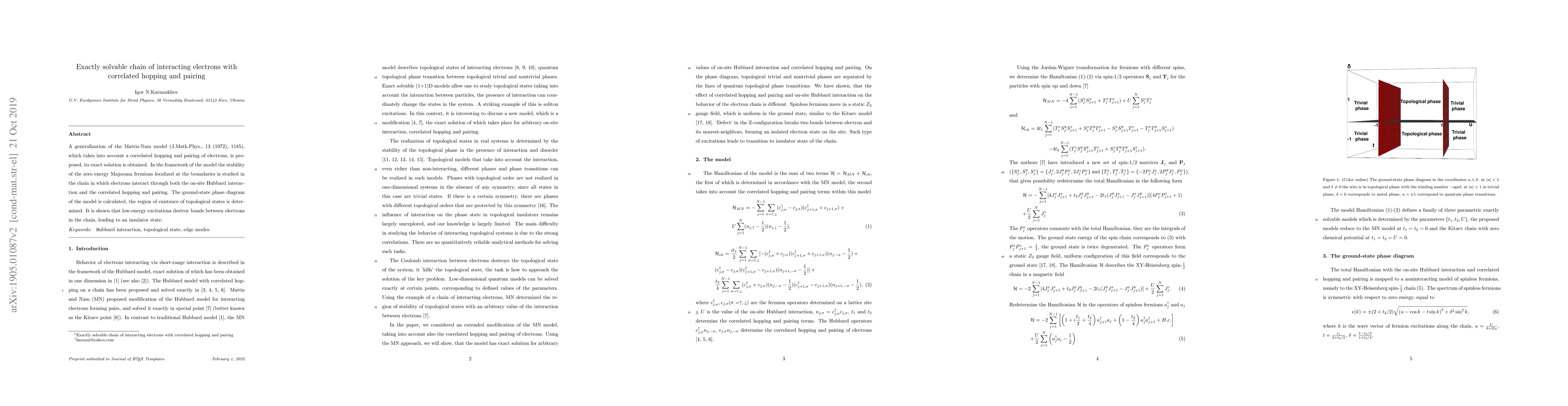 This paper proposes a generalized Mattis-Nam model incorporating correlated hopping and pairing of electrons, deriving its exact solution. It examines the stability of zero-energy Majorana fermions and determines the ground-state phase diagram, identifying regions of topological states and concluding that low-energy excitations result in an insulating state.