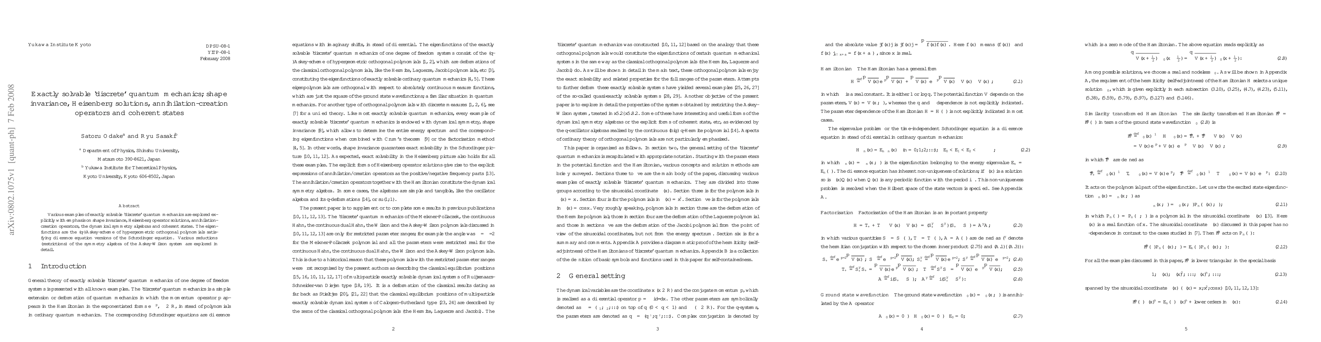 Various examples of exactly solvable `discrete' quantum mechanics are explored explicitly with emphasis on shape invariance, Heisenberg operator solutions, annihilation-creation operators, the dynamical symmetry algebras and coherent states. The eigenfunctions are the (q-)Askey-scheme of hypergeometric orthogonal polynomials satisfying difference equation versions of the Schr\"odinger equation. Various reductions (restrictions) of the symmetry algebra of the Askey-Wilson system are explored in detail.