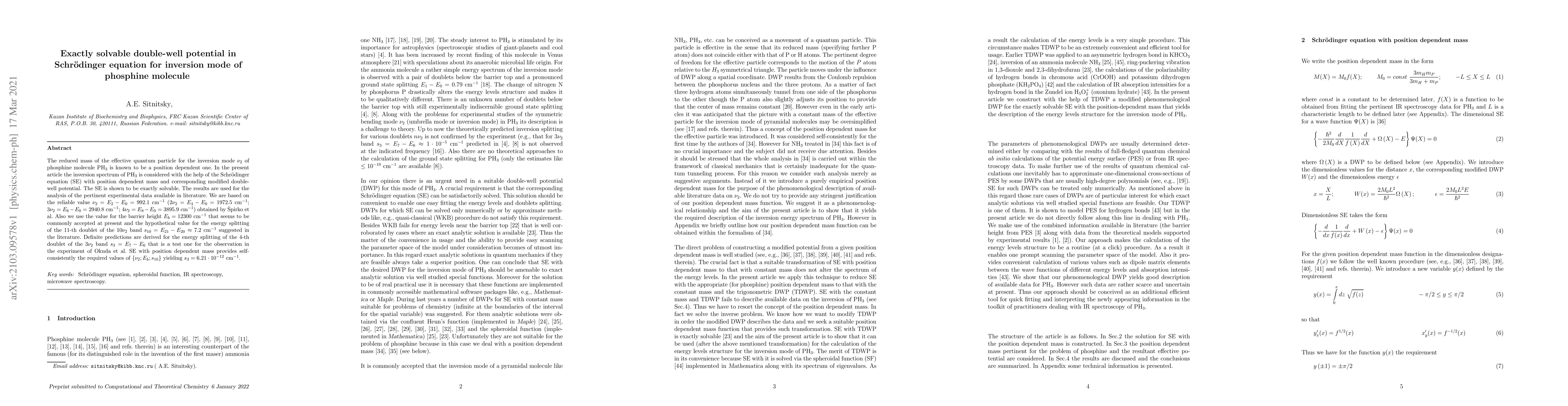 The reduced mass of the effective quantum particle for the inversion mode $\nu_2$ of phosphine molecule ${\rm{PH_3}}$ is known to be a position dependent one. In the present article the inversion spectrum of ${\rm{PH_3}}$ is considered with the help of the Schr\"odinger equation (SE) with position dependent mass and corresponding modified double-well potential. The SE is shown to be exactly solvable. The results are used for the analysis of the pertinent experimental data available in literature. We are based on the reliable value $\nu_2=E_2-E_0=992.1\ {\rm cm^{-1}}$ ($2\nu_2=E_4-E_0=1972.5\ {\rm cm^{-1}}$; $3\nu_2=E_6-E_0=2940.8\ {\rm cm^{-1}}$; $4\nu_2=E_8-E_0=3895.9\ {\rm cm^{-1}}$) obtained by \v Spirko et al. Also we use the value for the barrier height $E_b=12300 \ {\rm cm^{-1}}$ that seems to be commonly accepted at present and the hypothetical value for the energy splitting of the 11-th doublet of the $10\nu_2$ band $s_{10}=E_{21}-E_{20}\approx 7.2\ {\rm cm^{-1}}$ suggested in the literature. Definite predictions are derived for the energy splitting of the 4-th doublet of the $3\nu_2$ band $s_3=E_{7}-E_{6}$ that is a test one for the observation in the experiment of Okuda et al. SE with position dependent mass provides self-consistently the required values of $\{\nu_2; E_b;s_{10}\}$ yielding $s_3= 6.21\cdot 10^{-12}\ {\rm cm^{-1}}$.