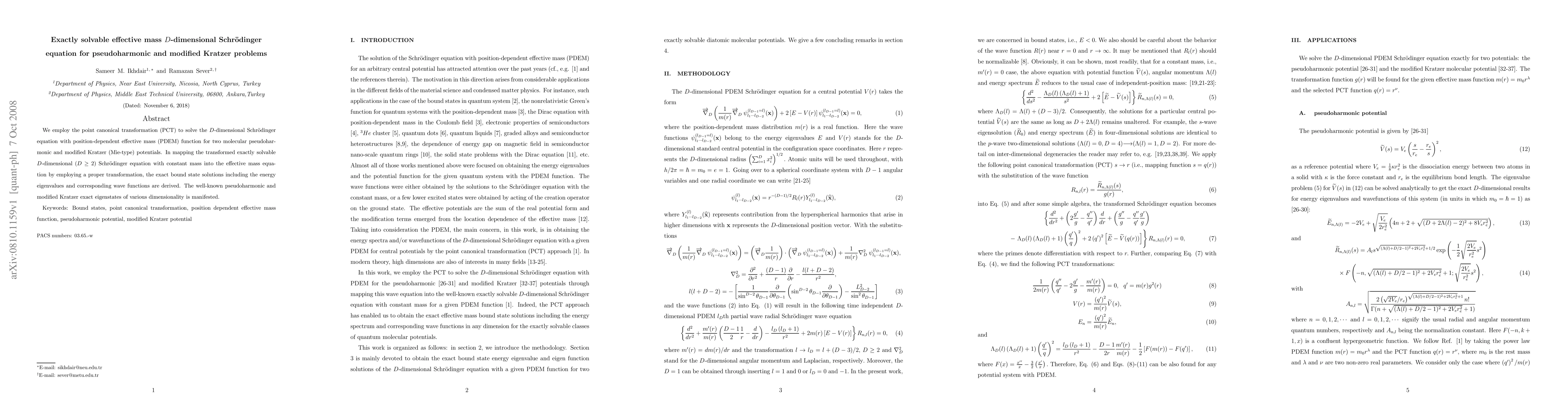 This paper solves the D-dimensional Schrödinger equation with a position-dependent effective mass using the point canonical transformation for pseudoharmonic and modified Kratzer potentials. Exact bound state solutions, including energy eigenvalues and wave functions, are derived for these potentials.