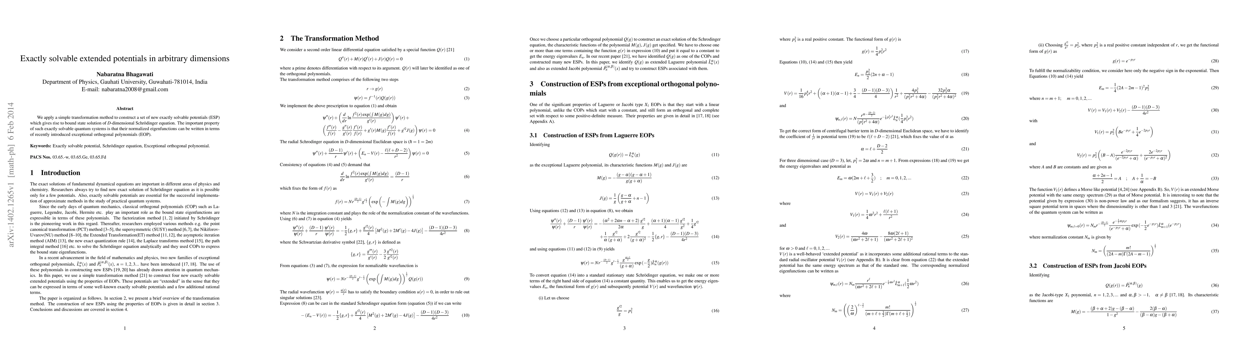 This paper introduces a new set of exactly solvable potentials (ESP) in $D$-dimensional systems using a transformation method, providing solutions to the Schrödinger equation. These potentials' eigenfunctions are expressed using exceptional orthogonal polynomials (EOP).