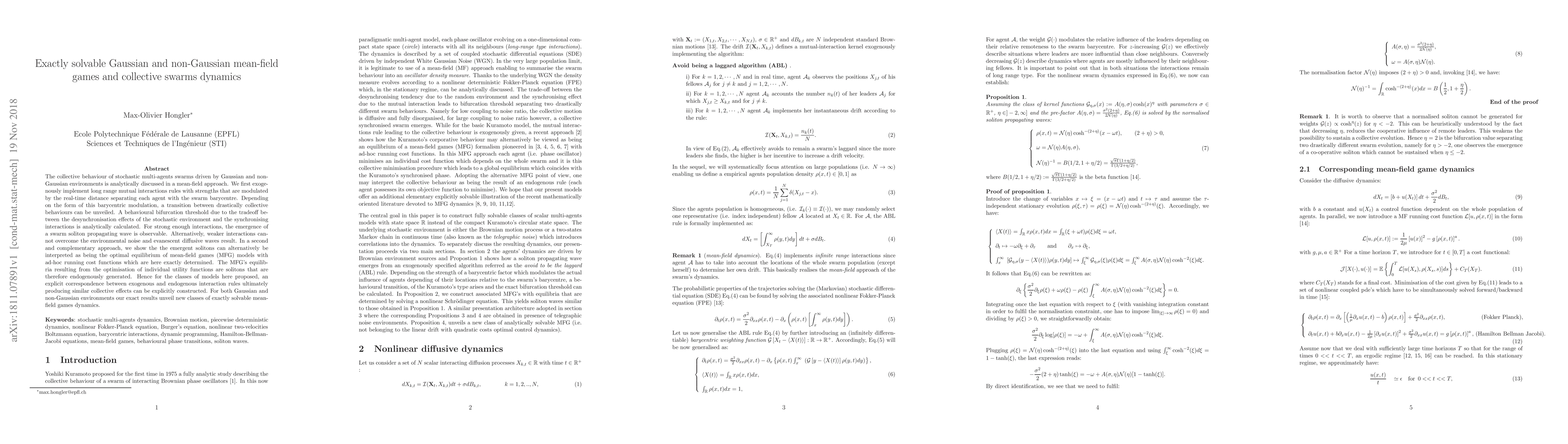A new class of exactly solvable mean-field games dynamics emerges in Gaussian and non-Gaussian environments, featuring swarm solitons that can either propagate or diffuse based on interaction strength.