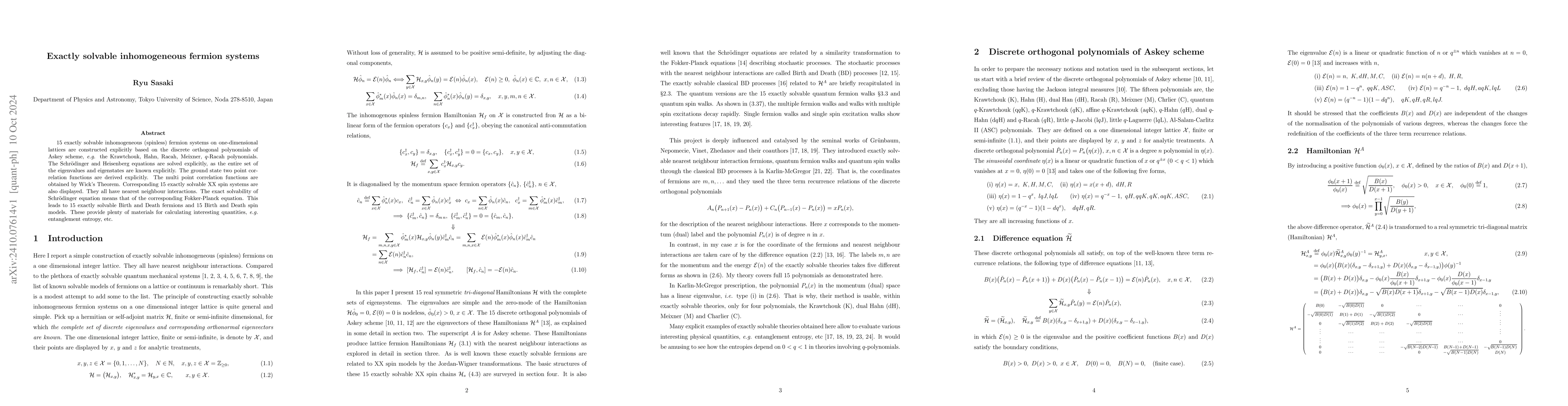 15 exactly solvable inhomogeneous (spinless) fermion systems on one-dimensional lattices are constructed explicitly based on the discrete orthogonal polynomials of Askey scheme, e.g. the Krawtchouk, Hahn, Racah, Meixner, $q$-Racah polynomials. The Schr\"odinger and Heisenberg equations are solved explicitly, as the entire set of the eigenvalues and eigenstates are known explicitly. The ground state two point correlation functions are derived explicitly. The multi point correlation functions are obtained by Wick's Theorem. Corresponding 15 exactly solvable XX spin systems are also displayed. They all have nearest neighbour interactions. The exact solvability of Schr\"odinger equation means that of the corresponding Fokker-Planck equation. This leads to 15 exactly solvable Birth and Death fermions and 15 Birth and Death spin models. These provide plenty of materials for calculating interesting quantities, e.g. entanglement entropy, etc.