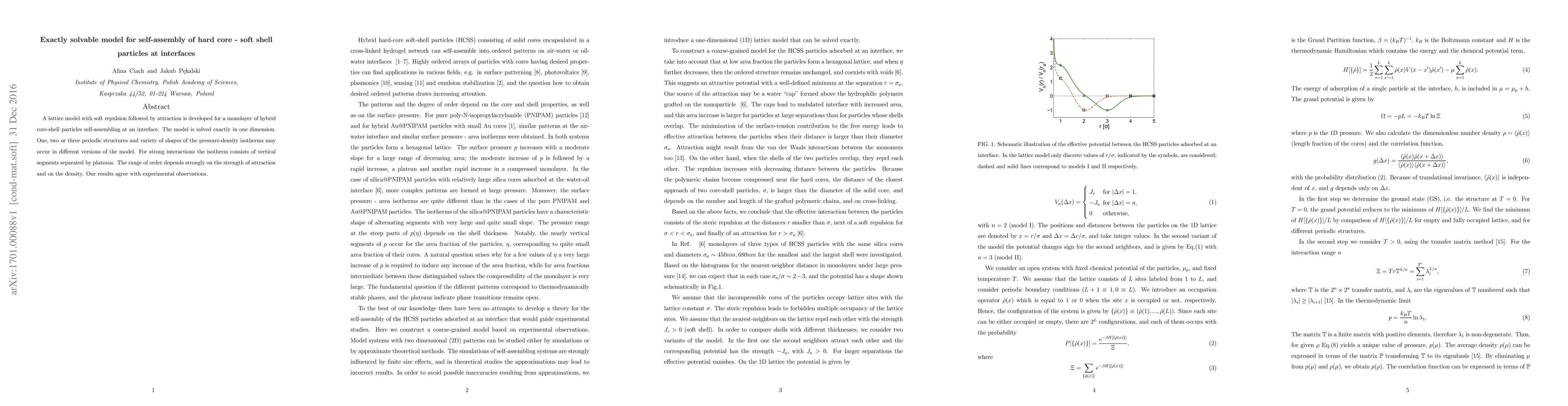 A lattice model with soft repulsion followed by attraction is developed for a monolayer of hybrid core-shell particles self-assembling at an interface. The model is solved exactly in one dimension. One, two or three periodic structures and variety of shapes of the pressure-density isotherms may occur in different versions of the model. For strong interactions the isotherm consists of vertical segments separated by plateaus. The range of order depends strongly on the strength of attraction and on the density. Our results agree with experimental observations.