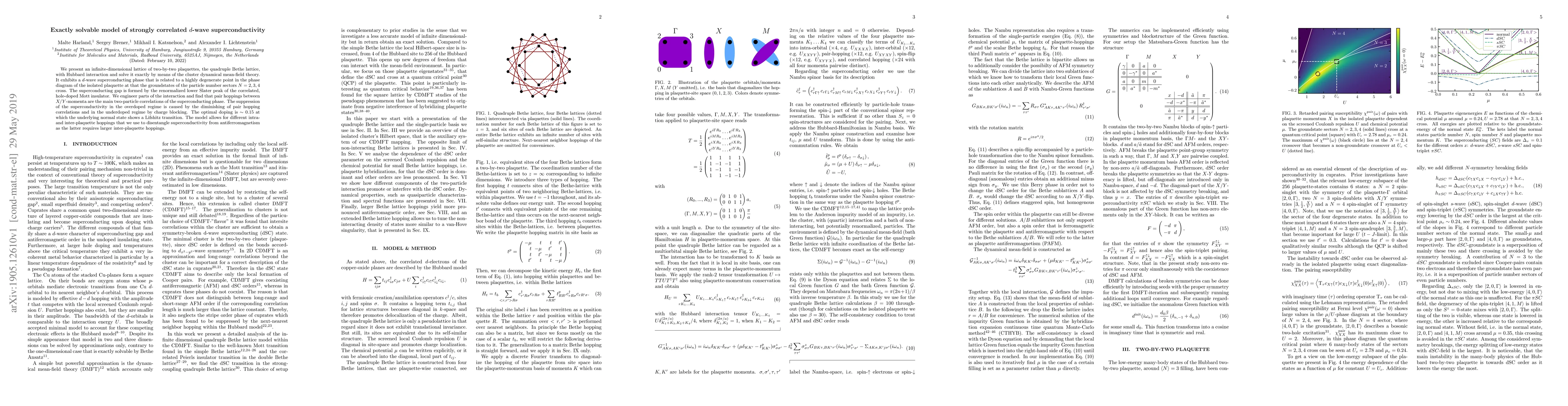 We present an infinite-dimensional lattice of two-by-two plaquettes, the quadruple Bethe lattice, with Hubbard interaction and solve it exactly by means of the cluster dynamical mean-field theory. It exhibits a $d$-wave superconducting phase that is related to a highly degenerate point in the phase diagram of the isolated plaquette at that the groundstates of the particle number sectors $N=2,3,4$ cross. The superconducting gap is formed by the renormalized lower Slater peak of the correlated, hole-doped Mott insulator. We engineer parts of the interaction and find that pair hoppings between $X/Y$-momenta are the main two-particle correlations of the superconducting phase. The suppression of the superconductivity in the overdoped regime is caused by the diminishing of pair hopping correlations and in the underdoped regime by charge blocking. The optimal doping is $\sim 0.15$ at which the underlying normal state shows a Lifshitz transition. The model allows for different intra- and inter-plaquette hoppings that we use to disentangle superconductivity from antiferromagnetism as the latter requires larger inter-plaquette hoppings.