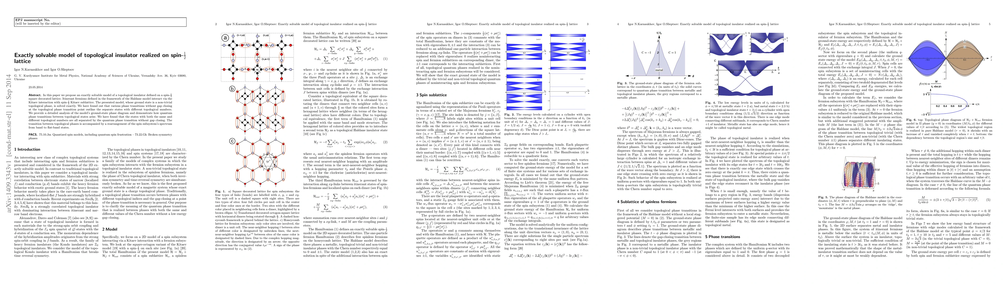 This paper proposes an exactly solvable model of a topological insulator on a spin-1/2 lattice, revealing various phase transitions without gap closing at the topological phase transition point. The model shows a rearrangement from band to flat-band states in the spin subsystem during transitions between topological phases.