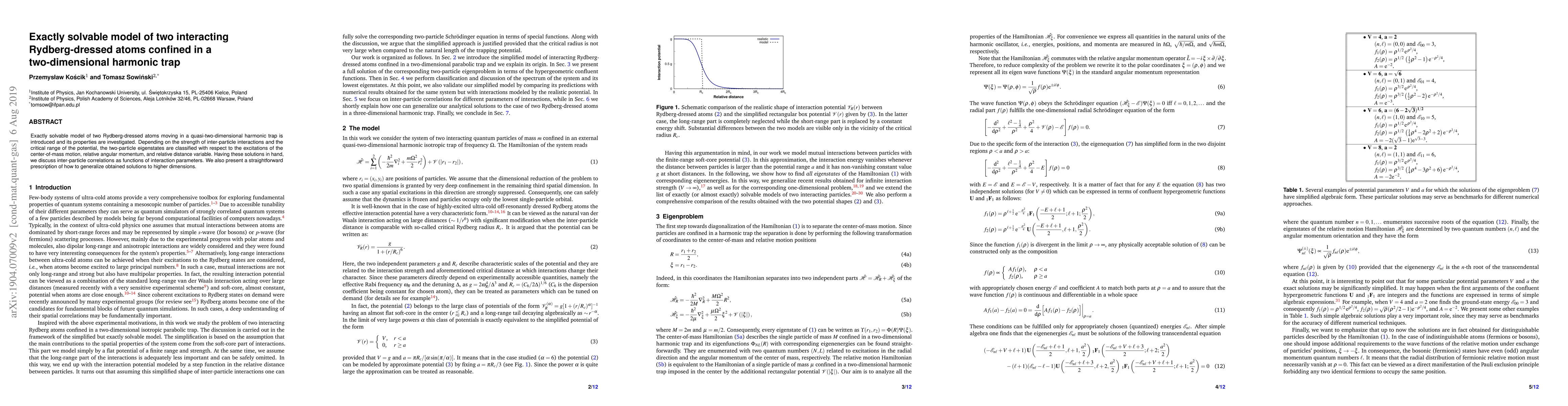 Exactly solvable model of two Rydberg-dressed atoms moving in a quasi-two-dimensional harmonic trap is introduced and its properties are investigated. Depending on the strength of inter-particle interactions and the critical range of the potential, the two-particle eigenstates are classified with respect to the excitations of the center-of-mass motion, relative angular momentum, and relative distance variable. Having these solutions in hand, we discuss inter-particle correlations as functions of interaction parameters. We also present a straightforward prescription of how to generalize obtained solutions to higher dimensions.