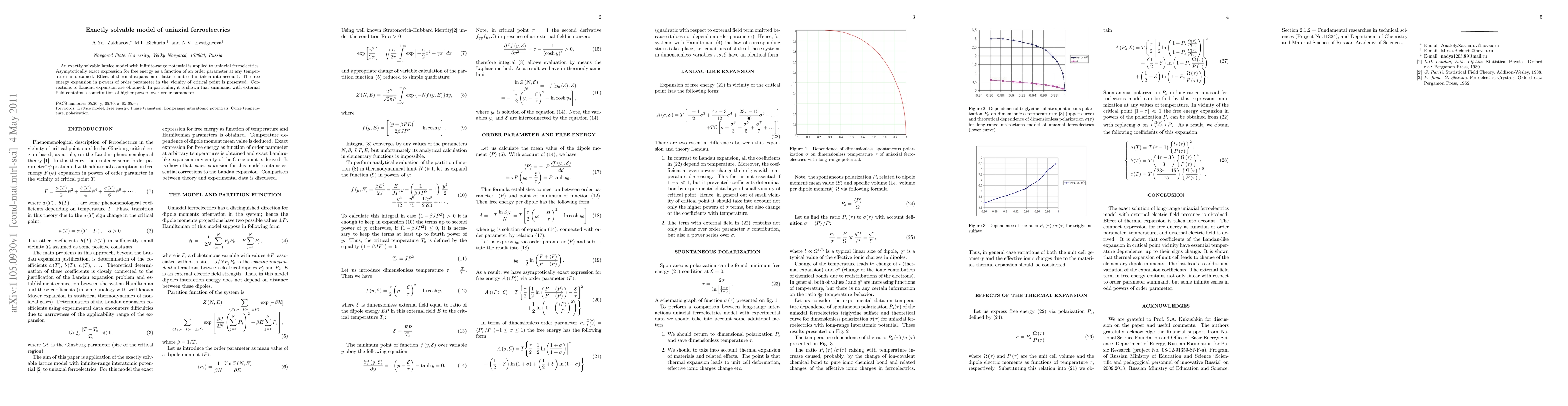 This paper presents an exactly solvable lattice model for uniaxial ferroelectrics, providing an asymptotically exact expression for free energy as a function of the order parameter at any temperature, including thermal lattice expansion effects. It also corrects the Landau expansion, showing higher-order contributions in the presence of an external field.