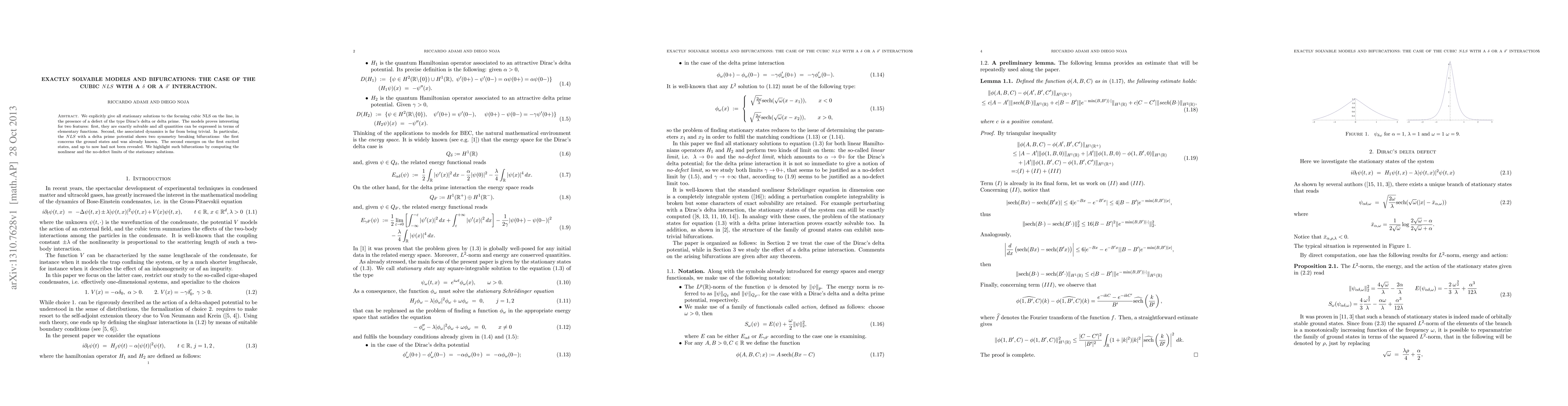 We explicitly give all stationary solutions to the focusing cubic NLS on the line, in the presence of a defect of the type Dirac's delta or delta prime. The models proves interesting for two features: first, they are exactly solvable and all quantities can be expressed in terms of elementary functions. Second, the associated dynamics is far from being trivial. In particular, the $NLS$ with a delta prime potential shows two symmetry breaking bifurcations: the first concerns the ground states and was already known. The second emerges on the first excited states, and up to now had not been revealed. We highlight such bifurcations by computing the nonlinear and the no-defect limits of the stationary solutions.