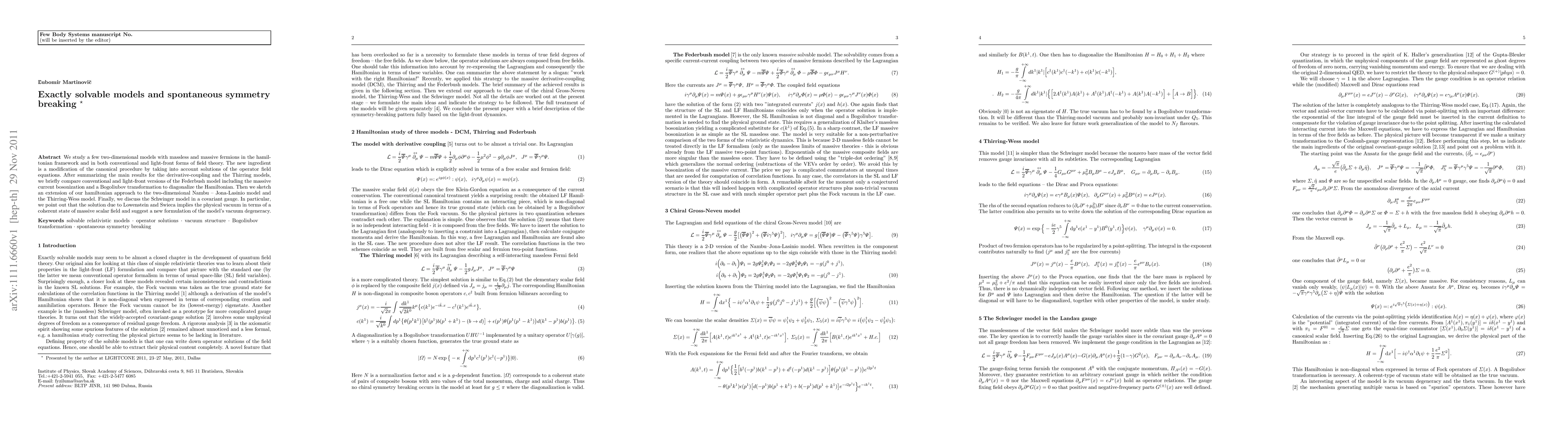 We study a few two-dimensional models with massive and massless fermions in the hamiltonian framework and in both conventional and light-front forms of field theory. The new ingredient is a modification of the canonical procedure by taking into account solutions of the operator field equations. After summarizing the main results for the derivative-coupling and the Thirring models, we briefly compare conventional and light-front versions of the Federbush model including the massive current bosonization and a Bogoliubov transformation to diagonalize the Hamiltonian. Then we sketch an extension of our hamiltonian approach to the two-dimensional Nambu--Jona-Lasinio model and the Thirring--Wess models. Finally, we discuss the Schwinger model in a covariant gauge. In particular, we point out that the solution due to Lowenstein and Swieca implies the physical vacuum in terms of a coherent state of massive scalar field and suggest a new formulation of the model's vacuum degeneracy.
