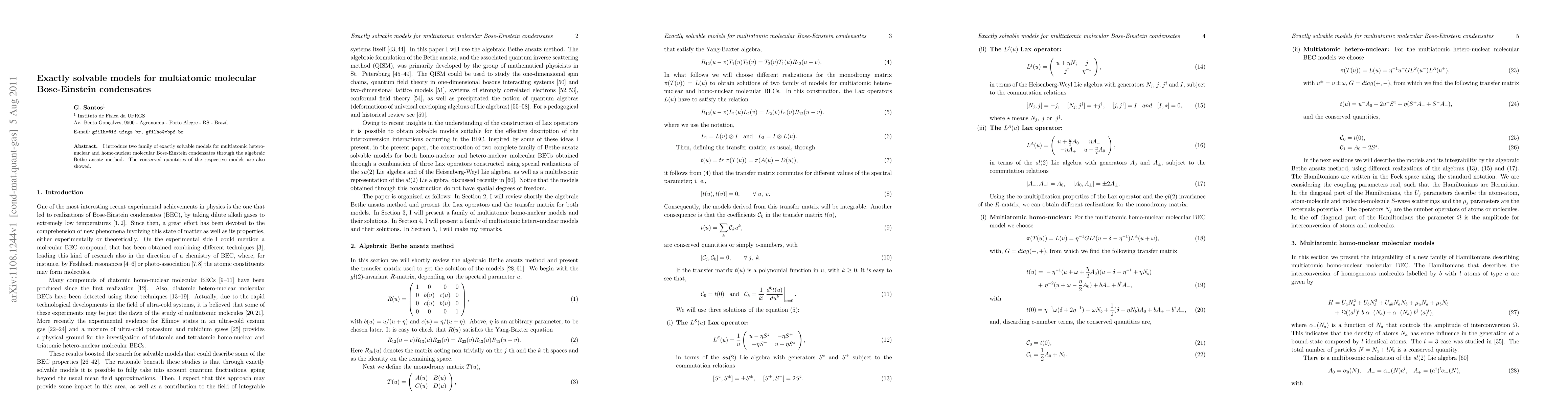 Summary: This paper presents two families of exactly solvable models for multiatomic molecular Bose-Einstein condensates using the algebraic Bethe ansatz method, and demonstrates the conserved quantities associated with these models.