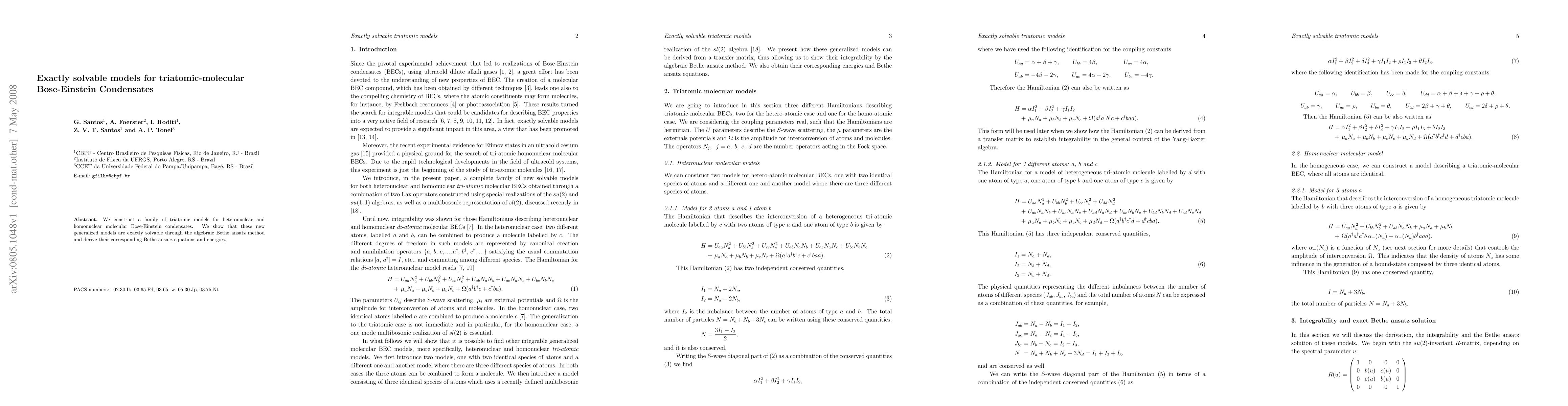 This paper constructs a set of triatomic models for both heteronuclear and homonuclear molecular Bose-Einstein condensates, demonstrating their exact solvability via the algebraic Bethe ansatz method and deriving the associated Bethe ansatz equations and energy spectra.