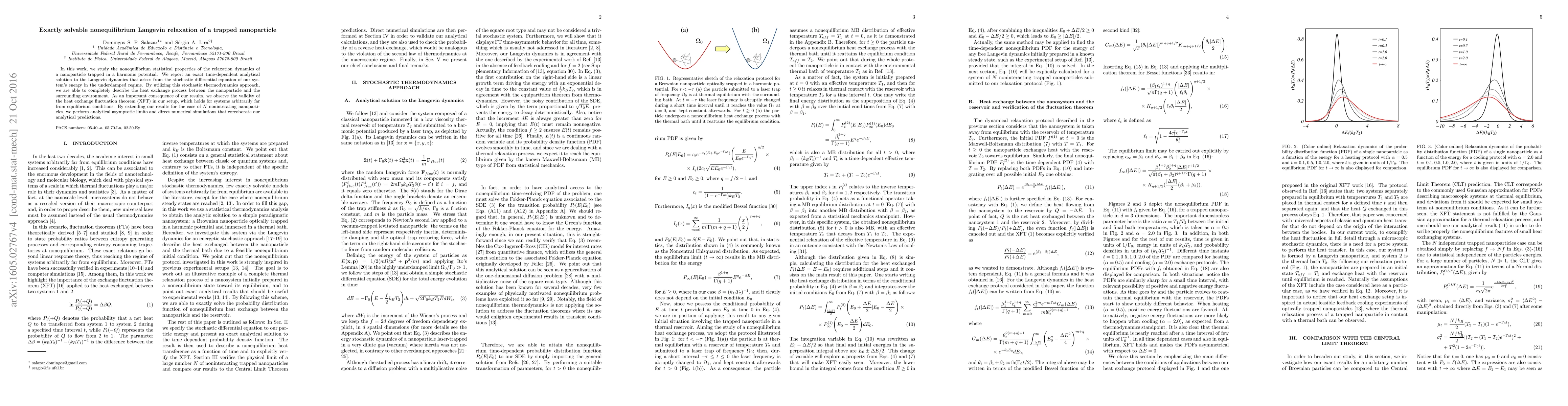 In this work, we study the nonequilibrium statistical properties of the relaxation dynamics of a nanoparticle trapped in a harmonic potential. We report an exact time-dependent analytical solution to the Langevin dynamics that arises from the stochastic differential equation of our system's energy in the underdamped regime. By utilizing this stochastic thermodynamics approach, we are able to completely describe the heat exchange process between the nanoparticle and the surrounding environment. As an important consequence of our results, we observe the validity of the heat exchange fluctuation theorem (XFT) in our setup, which holds for systems arbitrarily far from equilibrium conditions. By extending our results for the case of $N$ noninterating nanoparticles, we perform analytical asymptotic limits and direct numerical simulations that corroborate our analytical predictions.