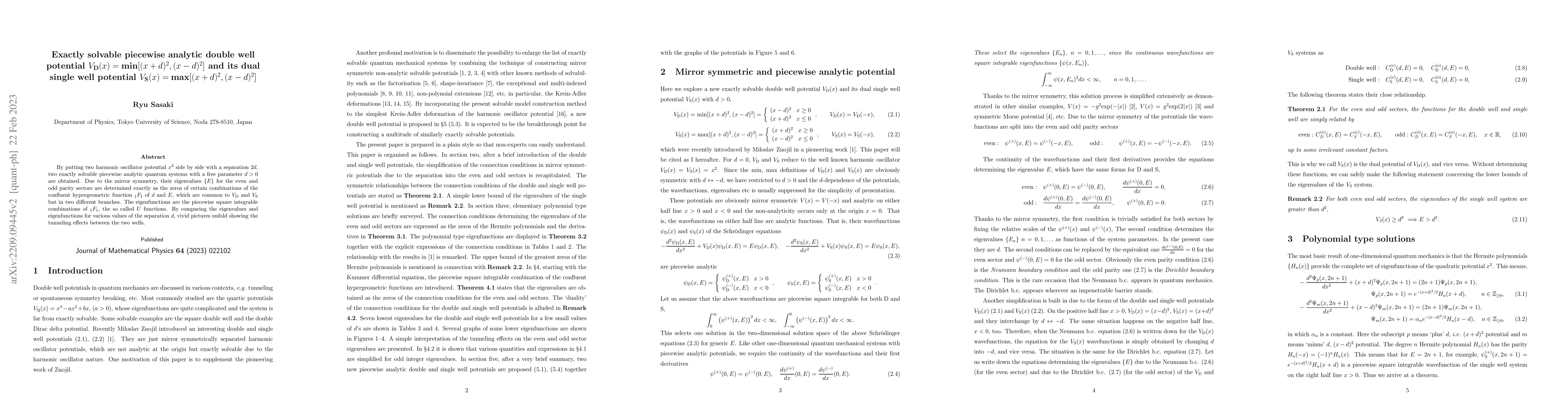 By putting two harmonic oscillator potential $x^2$ side by side with a separation $2d$, two exactly solvable piecewise analytic quantum systems with a free parameter $d>0$ are obtained. Due to the mirror symmetry, their eigenvalues $E$ for the even and odd parity sectors are determined exactly as the zeros of certain combinations of the confluent hypergeometric function ${}_1F_1$ of $d$ and $E$, which are common to $V_{D}$ and $V_{S}$ but in two different branches. The eigenfunctions are the piecewise square integrable combinations of ${}_1F_1$, the so called $U$ functions. By comparing the eigenvalues and eigenfunctions for various values of the separation $d$, vivid pictures unfold showing the tunneling effects between the two wells.