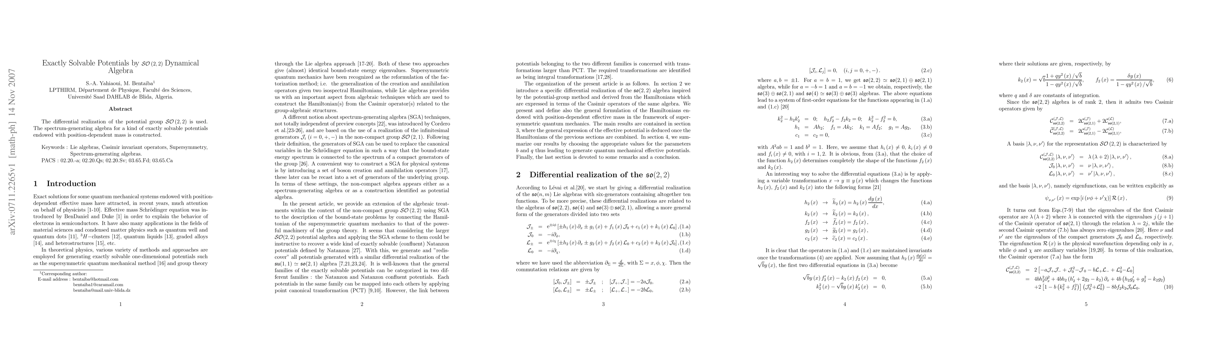 This paper constructs the spectrum-generating algebra for exactly solvable potentials using the differential realization of the SO(2,2) dynamical algebra, focusing on potentials with position-dependent mass. The methodology provides a framework for solving these potentials exactly.