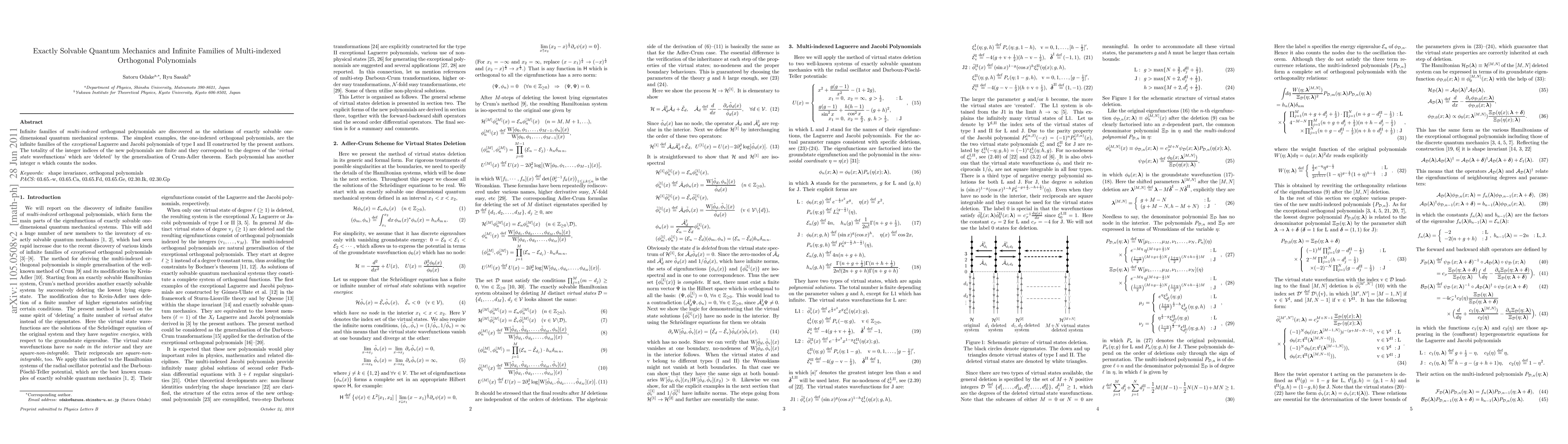 The paper presents exactly solvable one-dimensional quantum mechanical systems that yield infinite families of multi-indexed orthogonal polynomials, including exceptional Laguerre and Jacobi polynomials. These polynomials, with finite integer indices, represent 'virtual state wavefunctions' and each has an associated integer counting its nodes.