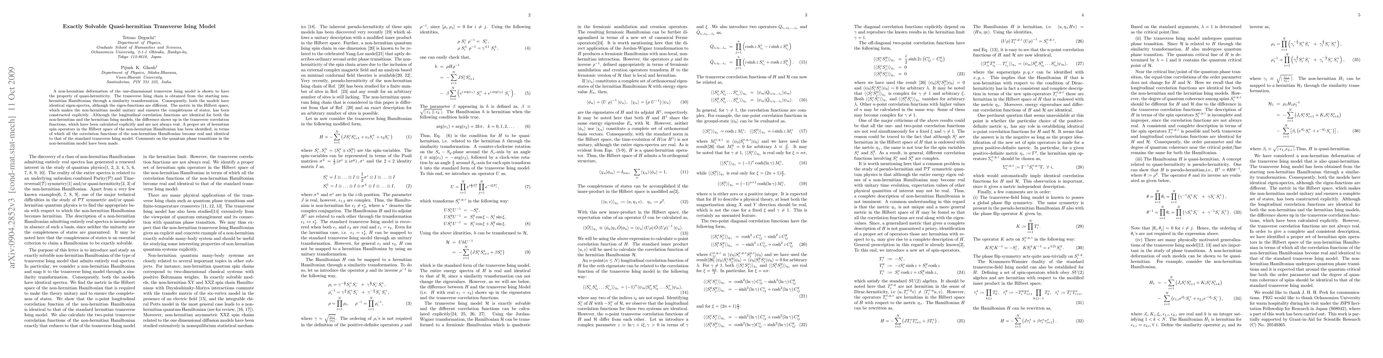 This paper demonstrates a quasi-hermitian deformation of the one-dimensional transverse Ising model, showing that it retains identical eigen-spectra to the standard model despite different eigen-functions. The study also identifies a proper set of hermitian spin operators that make correlation functions real and equivalent to those of the standard model, while discussing quantum phase transitions in the non-hermitian variant.