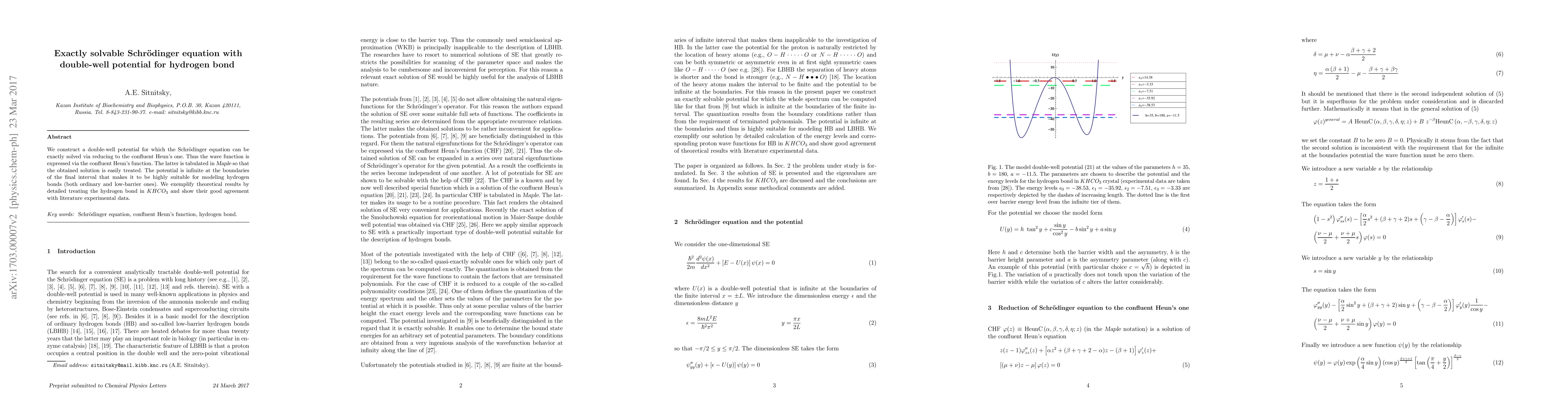 We construct a double-well potential for which the Schr\"odinger equation can be exactly solved via reducing to the confluent Heun's one. Thus the wave function is expressed via the confluent Heun's function. The latter is tabulated in {\sl {Maple}} so that the obtained solution is easily treated. The potential is infinite at the boundaries of the final interval that makes it to be highly suitable for modeling hydrogen bonds (both ordinary and low-barrier ones). We exemplify theoretical results by detailed treating the hydrogen bond in $KHCO_3$ and show their good agreement with literature experimental data.