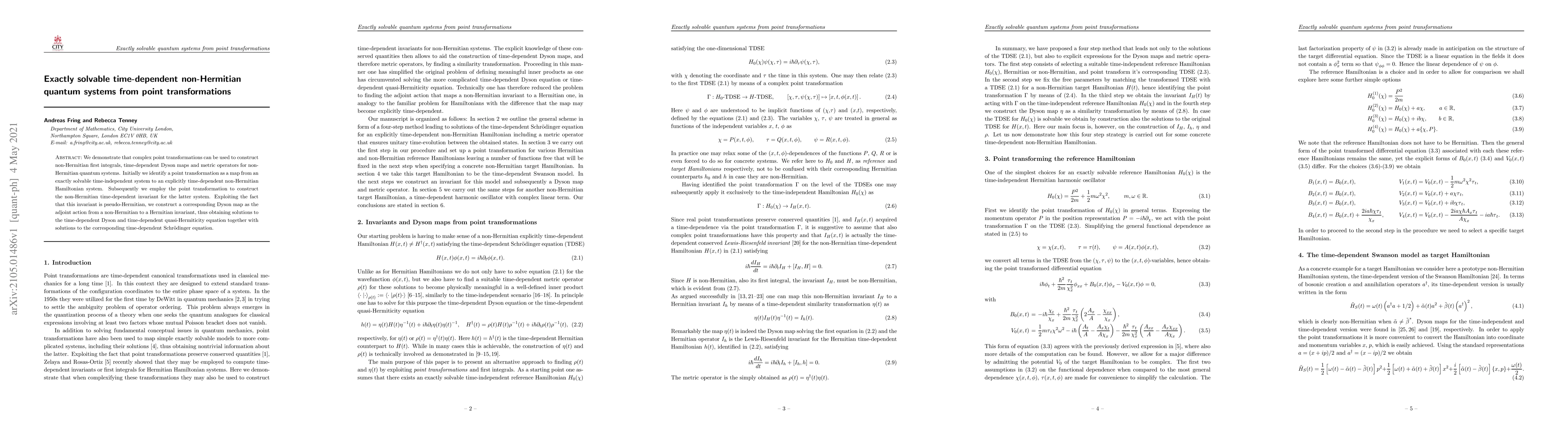 This paper shows how complex point transformations can generate non-Hermitian first integrals, time-dependent Dyson maps, and metric operators for time-dependent non-Hermitian quantum systems. It uses these transformations to construct pseudo-Hermitian invariants, leading to solutions for the time-dependent Dyson, quasi-Hermiticity, and Schrödinger equations.