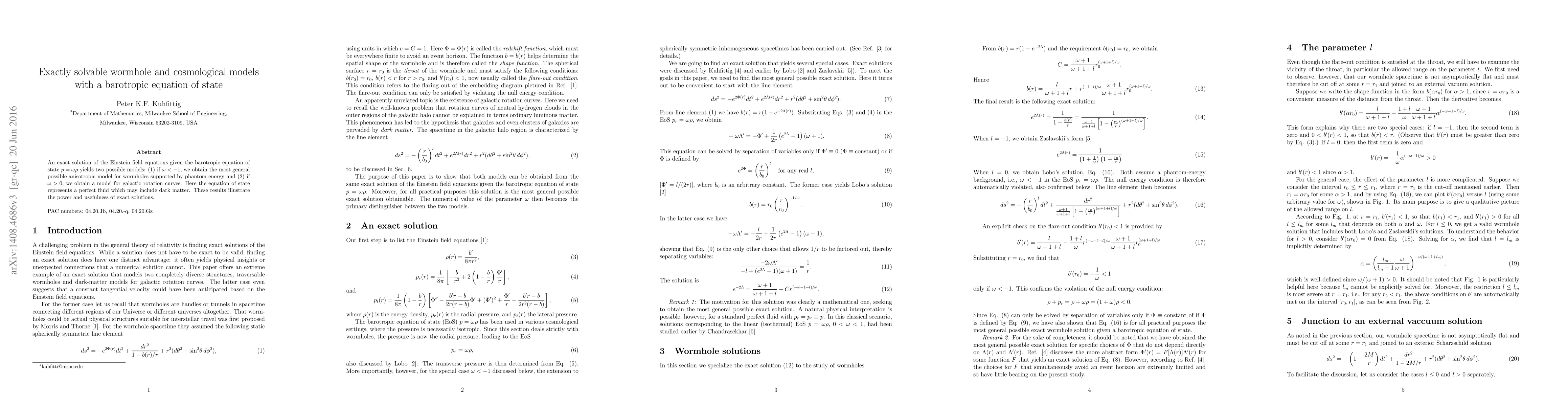 An exact solution of the Einstein field equations given the barotropic equation of state $p=\omega\rho$ yields two possible models: (1) if $\omega <-1$, we obtain the most general possible anisotropic model for wormholes supported by phantom energy and (2) if $\omega >0$, we obtain a model for galactic rotation curves. Here the equation of state represents a perfect fluid which may include dark matter. These results illustrate the power and usefulness of exact solutions.