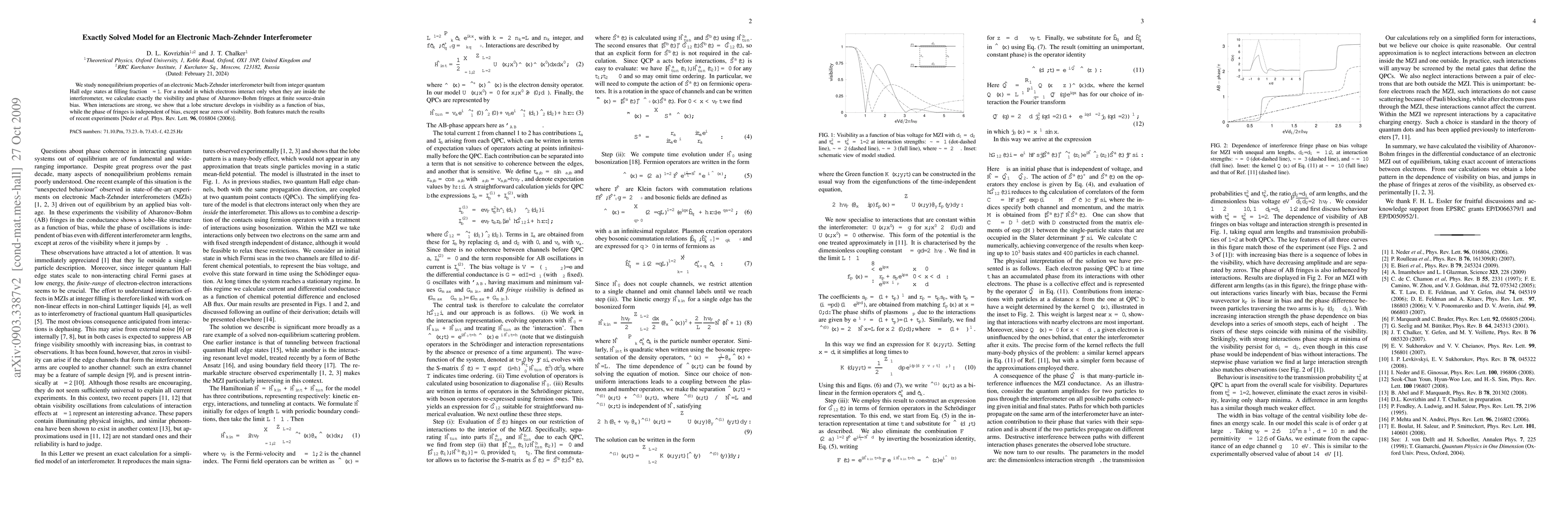 This paper exactly solves a nonequilibrium model of an electronic Mach-Zehnder interferometer, revealing that visibility of Aharonov-Bohm fringes exhibits a lobe structure with strong interactions, while the fringe phase remains bias-independent except near visibility zeros, matching recent experimental findings.