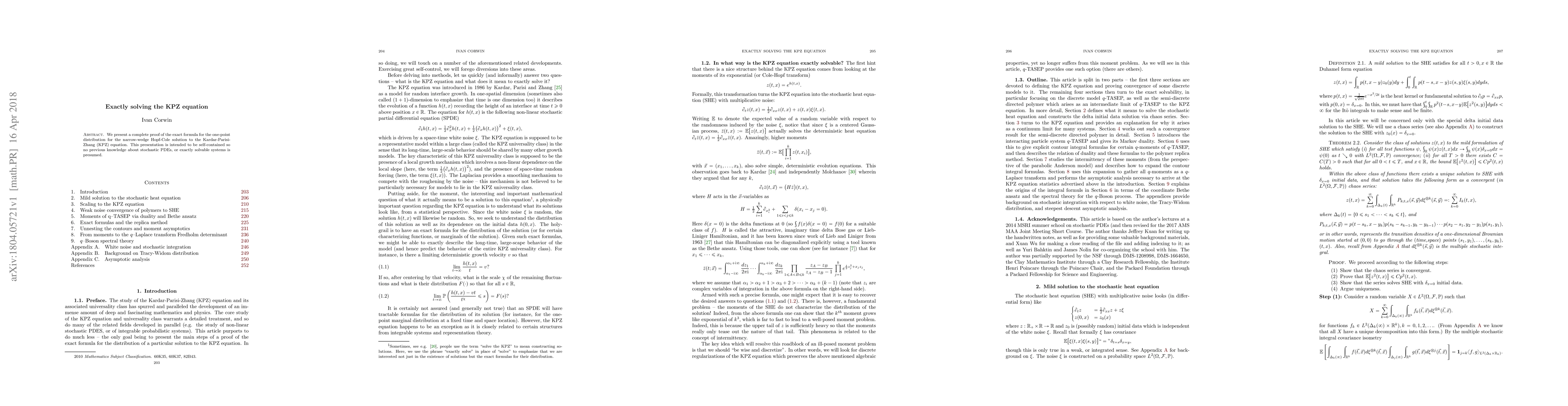 We present a complete proof of the exact formula for the one-point distribution for the narrow-wedge Hopf-Cole solution to the Kardar-Parisi-Zhang (KPZ) equation. This presentation is intended to be self-contained so no previous knowledge about stochastic PDEs, or exactly solvable systems is presumed.