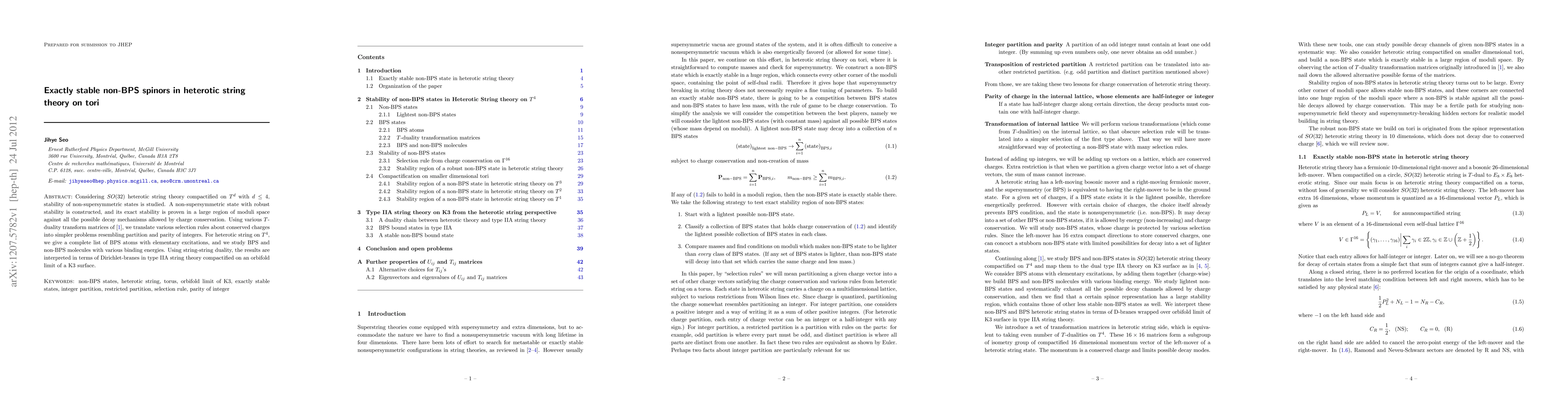 This paper explores the stability of non-BPS states in SO(32) heterotic string theory on tori, constructing and proving the exact stability of a robust non-supersymmetric state. It utilizes T-duality to simplify conserved charge selection rules and provides a complete list of BPS atoms and molecules for heterotic string on T^4, interpreting the results via string-string duality in terms of Dirichlet-branes in type IIA theory.