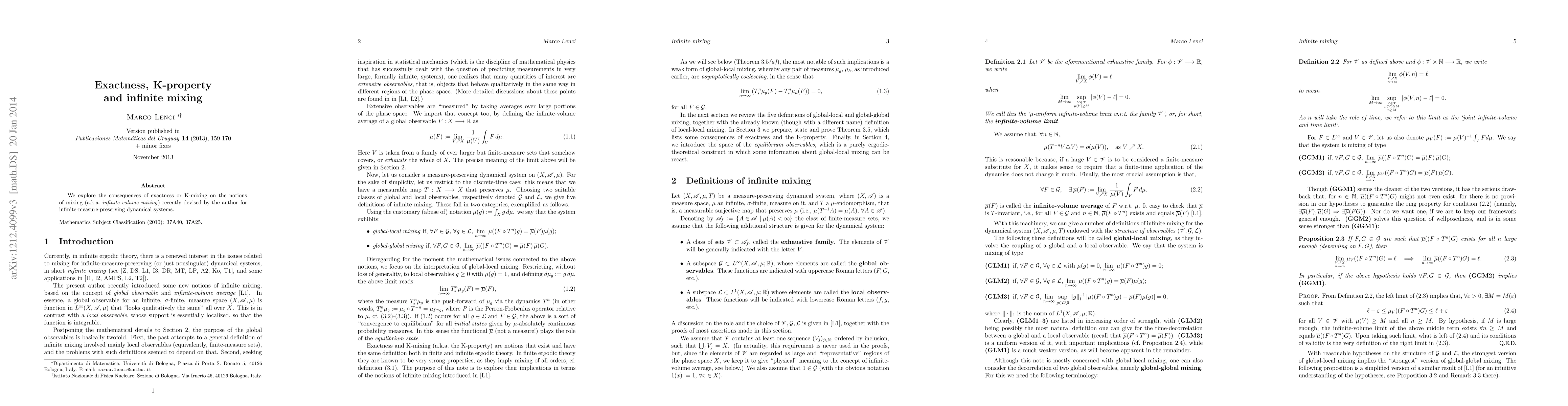 We explore the consequences of exactness or K-mixing on the notions of mixing (a.k.a. infinite-volume mixing) recently devised by the author for infinite-measure-preserving dynamical systems.