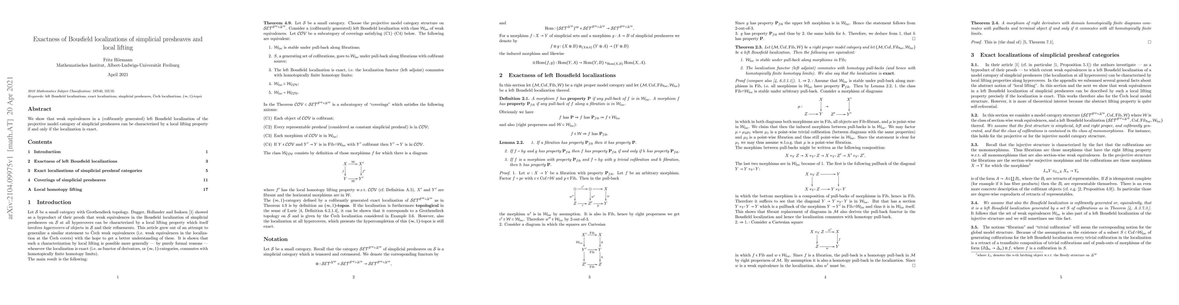 Summary: This paper demonstrates that weak equivalences in a left Bousfield localization of simplicial presheaves correspond to a local lifting property if and only when the localization is exact. The study focuses on cofibrantly generated projective model categories.