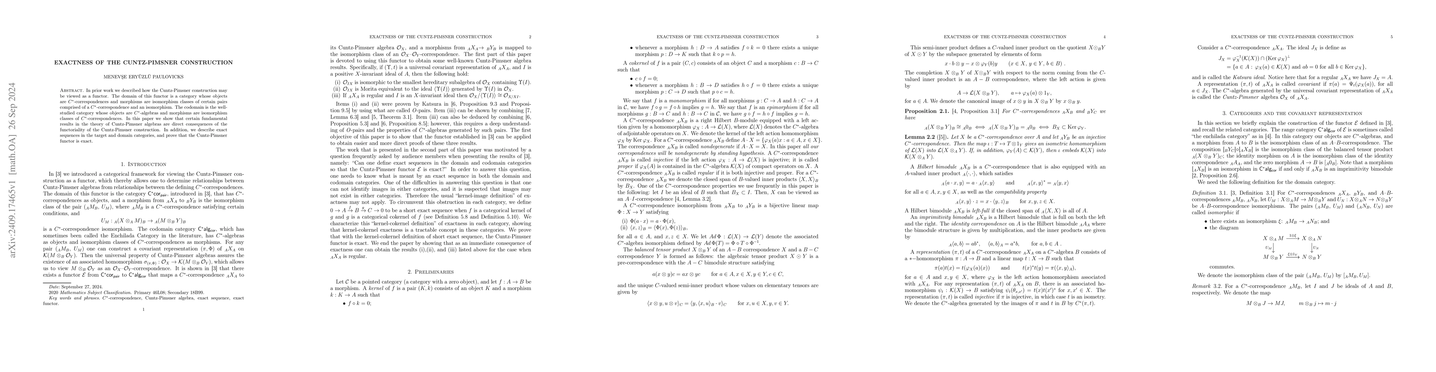This paper demonstrates that the Cuntz-Pimsner construction can be treated as a functor, showing that it preserves exact sequences. It proves the functor's exactness by linking fundamental results in Cuntz-Pimsner algebra theory to the functoriality of the construction.