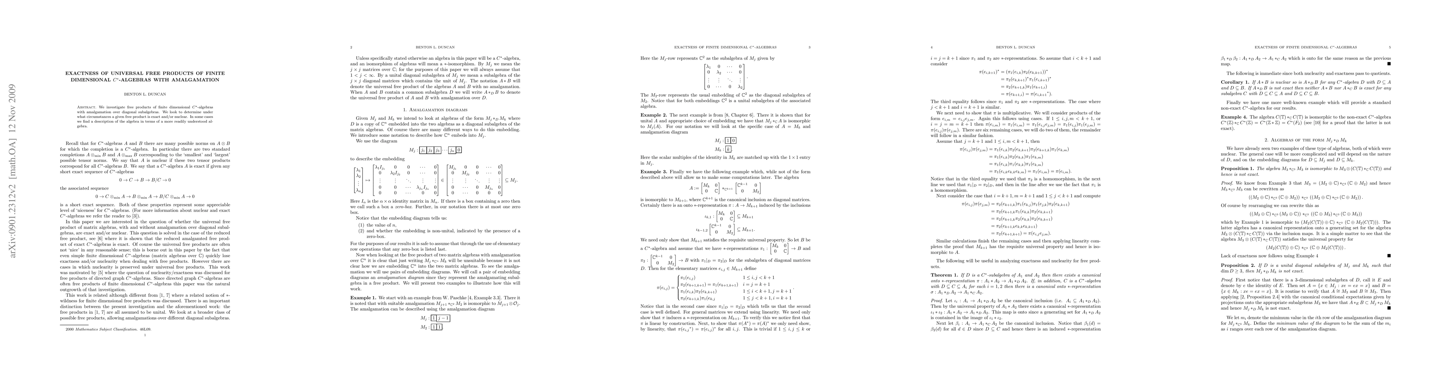 We investigate free products of finite dimensional $C^*$-algebras with amalgamation over diagonal subalgebras. We look to determine under what circumstances a given free product is exact and/or nuclear. In some cases we find a description of the algebra in terms of a more readily understood algebra.