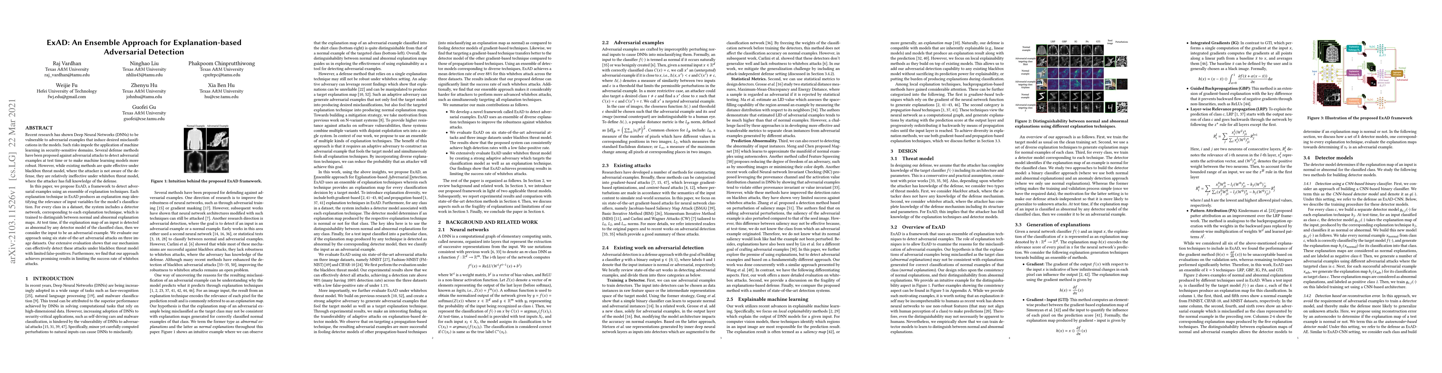 ExAD detects adversarial examples using an ensemble of explanation techniques that identify input variable relevance, achieving promising results under both blackbox and whitebox threat models with limited false-positives.