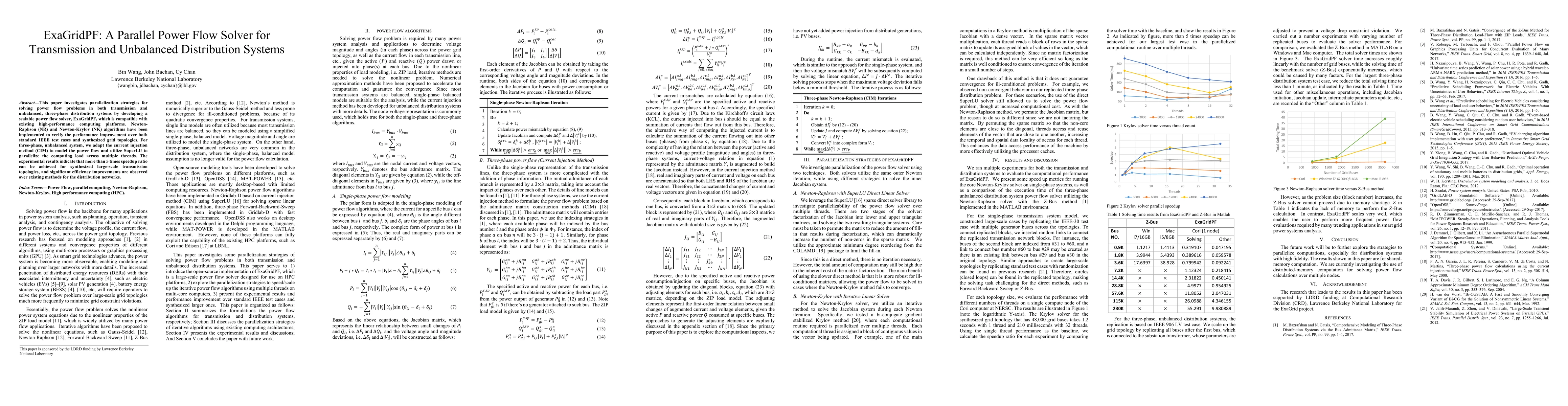 This paper develops ExaGridPF, a scalable parallel power flow solver for transmission and unbalanced distribution systems, employing Newton-Raphson and Newton-Krylov algorithms to achieve significant speedups over standard methods, especially in large-scale transmission networks and distribution systems.