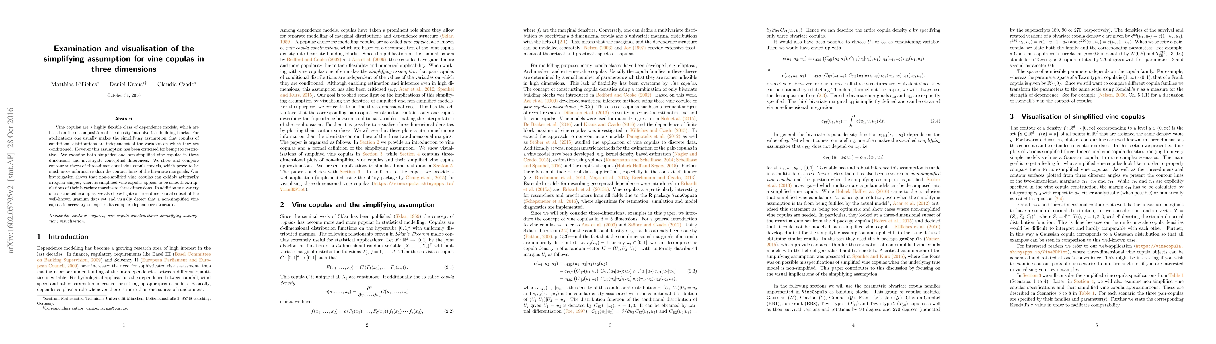 This paper examines the simplifying assumption in vine copulas, comparing simplified and non-simplified models in three dimensions. It finds that non-simplified models can capture irregular shapes, while simplified models appear smoother, and demonstrates this through visual contour surfaces and analysis of uranium data.