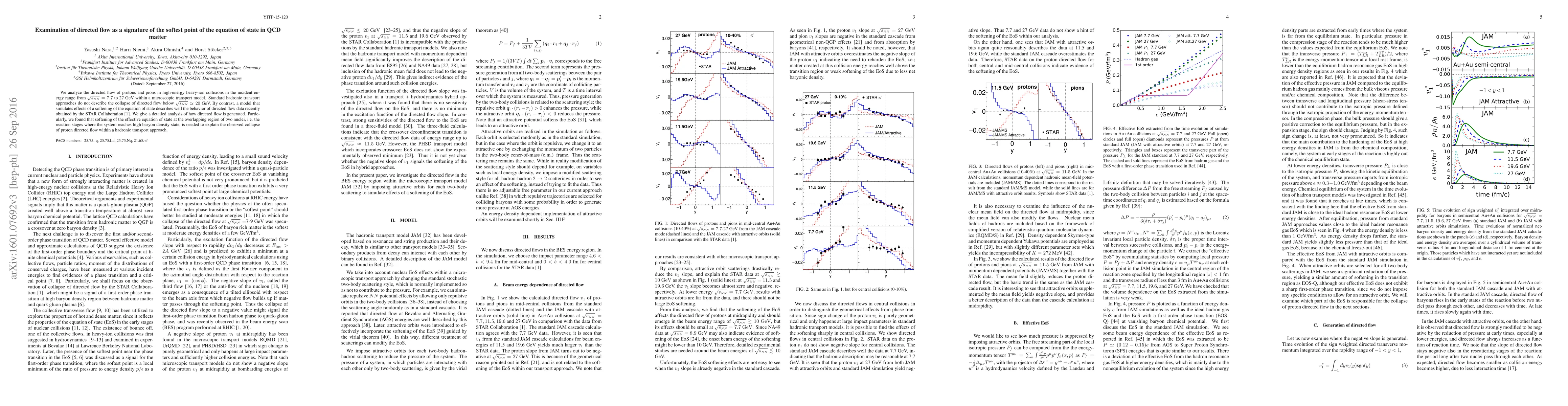 We analyze the directed flow of protons and pions in high-energy heavy-ion collisions in the incident energy range from $\sqrt{s_{{\scriptscriptstyle NN}}}=7.7$ to 27 GeV within a microscopic transport model. Standard hadronic transport approaches do not describe the collapse of directed flow below $\sqrt{s_{{\scriptscriptstyle NN}}}\simeq 20$ GeV. By contrast, a model which simulates effects of a softening of the equation of state, well describes the behavior of directed flow data recently obtained by the STAR Collaboration~\cite{STARv1}. We give a detailed analysis of how directed flow is generated. Particularly, we found that softening of effective equation of state at the overlapping region of two nuclei, i.e. the reaction stages where the system reaches high baryon density state, is needed to explain the observed collapse of proton directed flow within a hadronic transport approach.