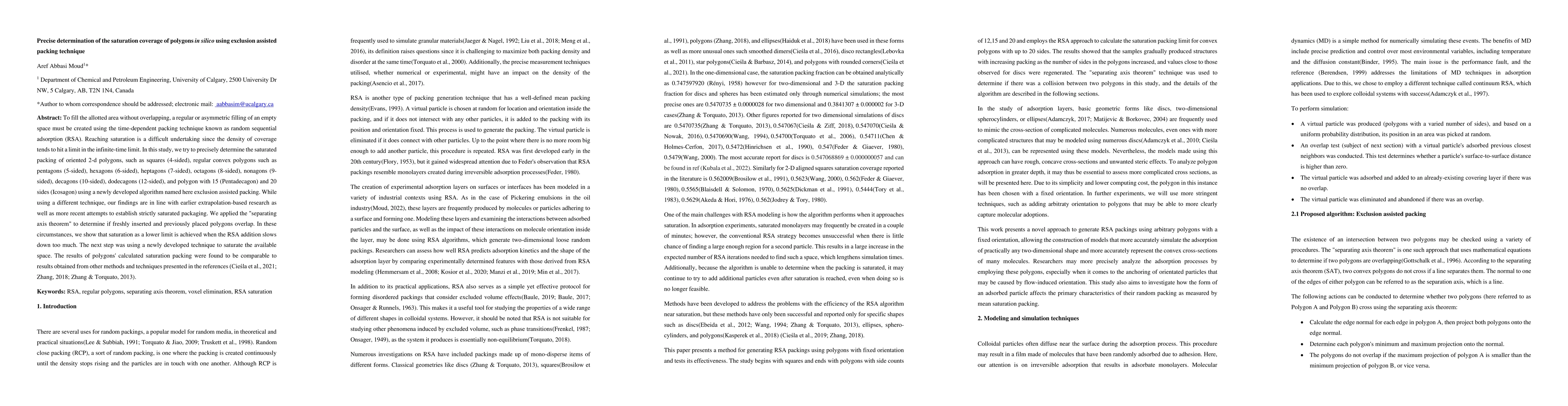 This paper examines the saturation coverage of various 2-D polygons using the random sequential adsorption algorithm, finding consistent results with previous studies. The study employs the separating axis theorem to prevent overlaps and defines saturation as the point where RSA addition slows excessively.