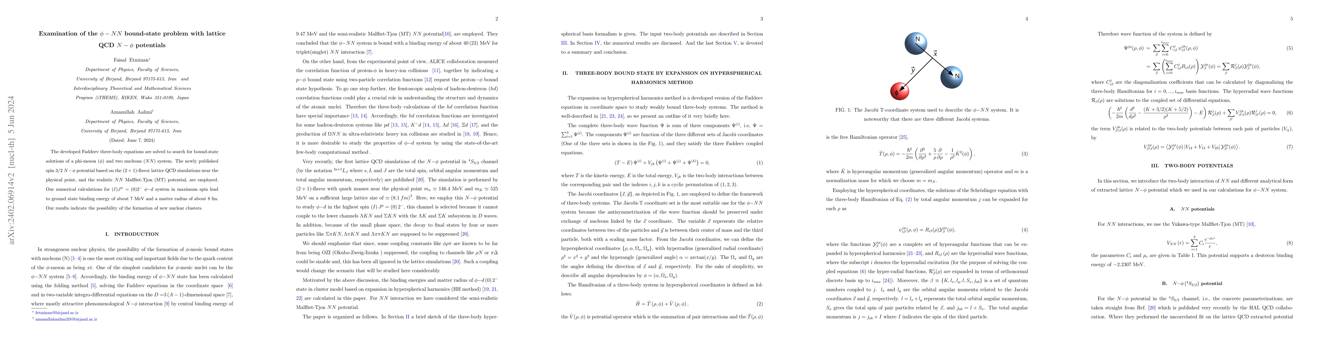 The developed Faddeev three-body equations are solved to search for bound-state solutions of a phi-meson $ \left(\phi\right) $ and two nucleons $ \left( \textrm{NN} \right) $ system. The newly published spin $ 3/2 $ $ \textrm{N-\ensuremath{\phi}} $ potential based on the $ \left(\textrm{2+1}\right) $-flavor lattice QCD simulations near physical point, and realistic $ \textrm{NN} $ Malfliet-Tjon (MT) potential, are employed. Our numerical calculations for $ (I)J^{\pi}=(0)2^{-}$ $ \phi\textrm{-d} $ system in maximum spin leads to ground state binding energy of about $ 7 $ MeV and a matter radius of about $ 8 $ fm. Our results indicates the possibility of the formation of new nuclear clusters.