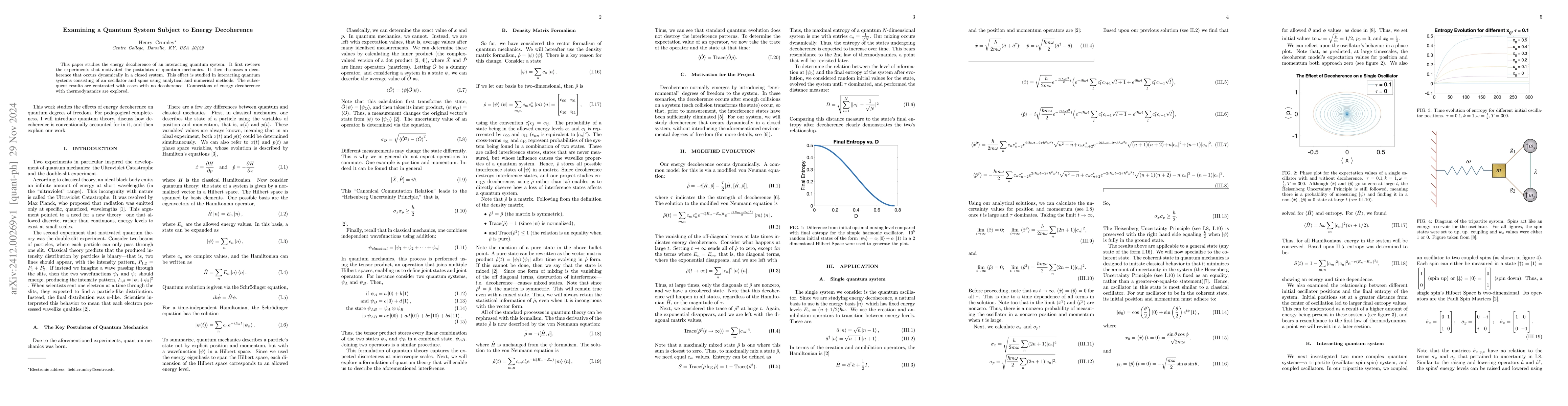 This paper studies the energy decoherence of an interacting quantum system. It first reviews the experiments that motivated the postulates of quantum mechanics. It then discusses a decoherence that occurs dynamically in a closed system. This effect is studied in interacting quantum systems consisting of an oscillator and spins using analytical and numerical methods. The subsequent results are contrasted with cases with no decoherence. Connections of energy decoherence with thermodynamics are explored.