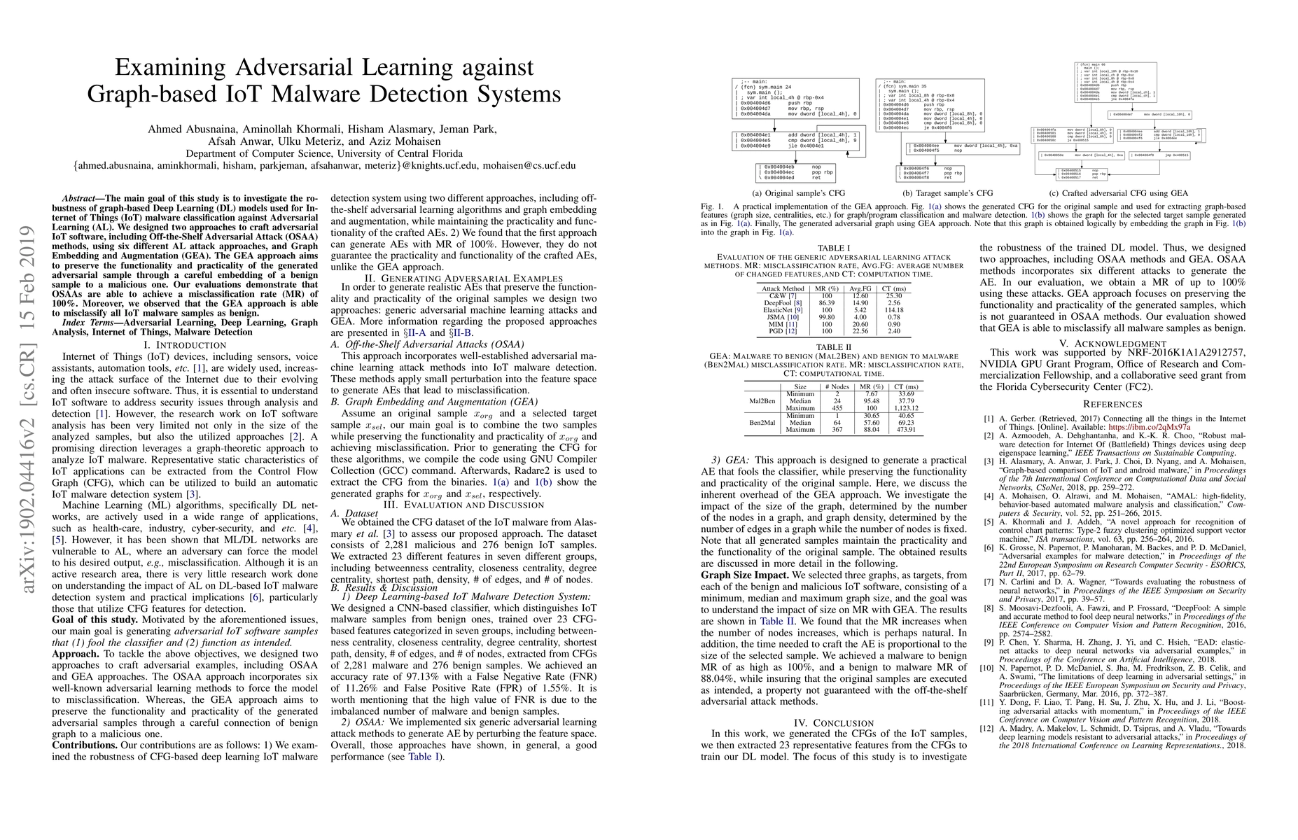 The main goal of this study is to investigate the robustness of graph-based Deep Learning (DL) models used for Internet of Things (IoT) malware classification against Adversarial Learning (AL). We designed two approaches to craft adversarial IoT software, including Off-the-Shelf Adversarial Attack (OSAA) methods, using six different AL attack approaches, and Graph Embedding and Augmentation (GEA). The GEA approach aims to preserve the functionality and practicality of the generated adversarial sample through a careful embedding of a benign sample to a malicious one. Our evaluations demonstrate that OSAAs are able to achieve a misclassification rate (MR) of 100%. Moreover, we observed that the GEA approach is able to misclassify all IoT malware samples as benign.