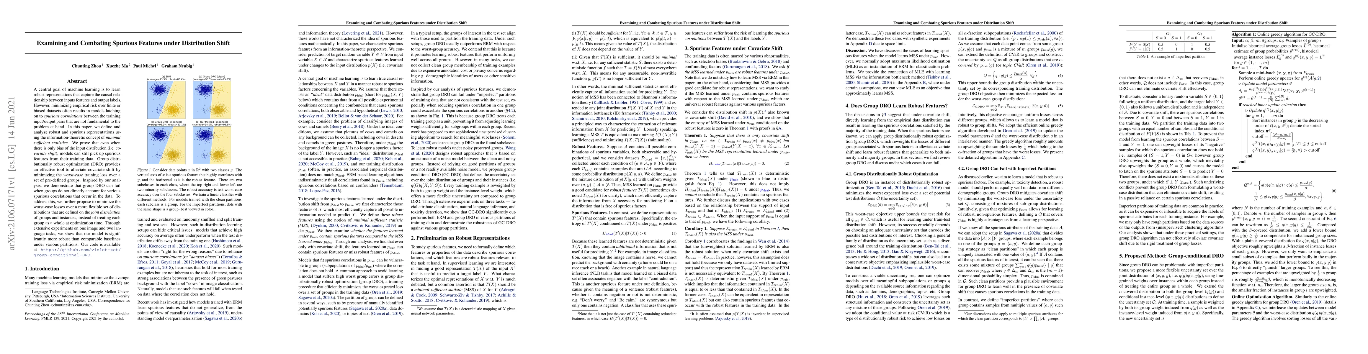A central goal of machine learning is to learn robust representations that capture the causal relationship between inputs features and output labels. However, minimizing empirical risk over finite or biased datasets often results in models latching on to spurious correlations between the training input/output pairs that are not fundamental to the problem at hand. In this paper, we define and analyze robust and spurious representations using the information-theoretic concept of minimal sufficient statistics. We prove that even when there is only bias of the input distribution (i.e. covariate shift), models can still pick up spurious features from their training data. Group distributionally robust optimization (DRO) provides an effective tool to alleviate covariate shift by minimizing the worst-case training loss over a set of pre-defined groups. Inspired by our analysis, we demonstrate that group DRO can fail when groups do not directly account for various spurious correlations that occur in the data. To address this, we further propose to minimize the worst-case losses over a more flexible set of distributions that are defined on the joint distribution of groups and instances, instead of treating each group as a whole at optimization time. Through extensive experiments on one image and two language tasks, we show that our model is significantly more robust than comparable baselines under various partitions. Our code is available at https://github.com/violet-zct/group-conditional-DRO.