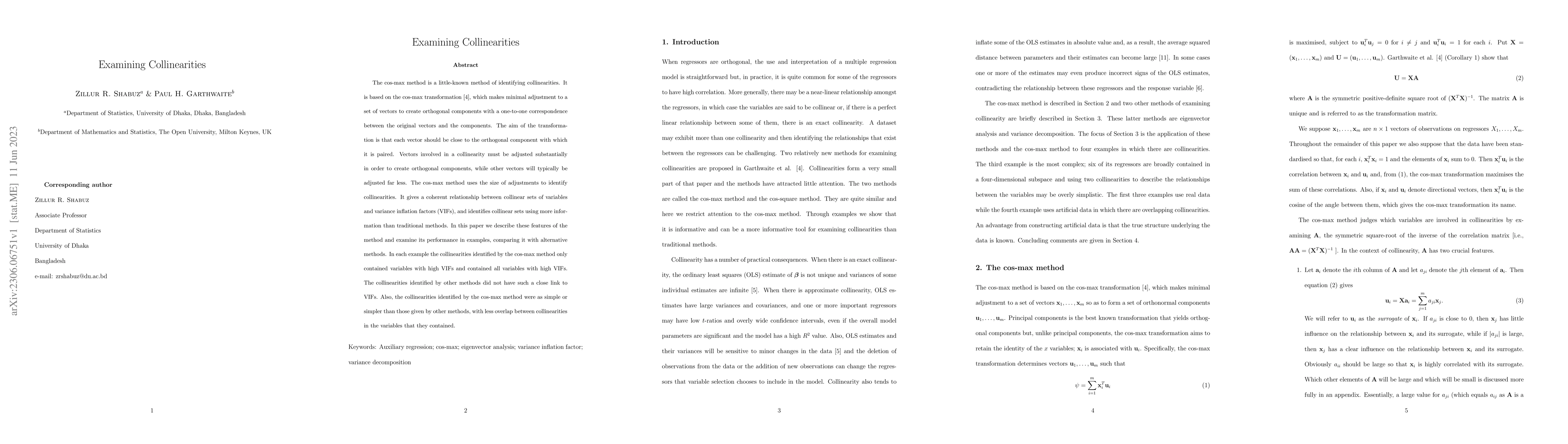 The cos-max method is a little-known method of identifying collinearities. It is based on the cos-max transformation [4], which makes minimal adjustment to a set of vectors to create orthogonal components with a one-to-one correspondence between the original vectors and the components. The aim of the transformation is that each vector should be close to the orthogonal component with which it is paired. Vectors involved in a collinearity must be adjusted substantially in order to create orthogonal components, while other vectors will typically be adjusted far less. The cos-max method uses the size of adjustments to identify collinearities. It gives a coherent relationship between collinear sets of variables and variance inflation factors (VIFs), and identifies collinear sets using more information than traditional methods. In this paper we describe these features of the method and examine its performance in examples, comparing it with alternative methods. In each example the collinearities identified by the cos-max method only contained variables with high VIFs and contained all variables with high VIFs. The collinearities identified by other methods did not have such a close link to VIFs. Also, the collinearities identified by the cos-max method were as simple or simpler than those given by other methods, with less overlap between collinearities in the variables that they contained.
