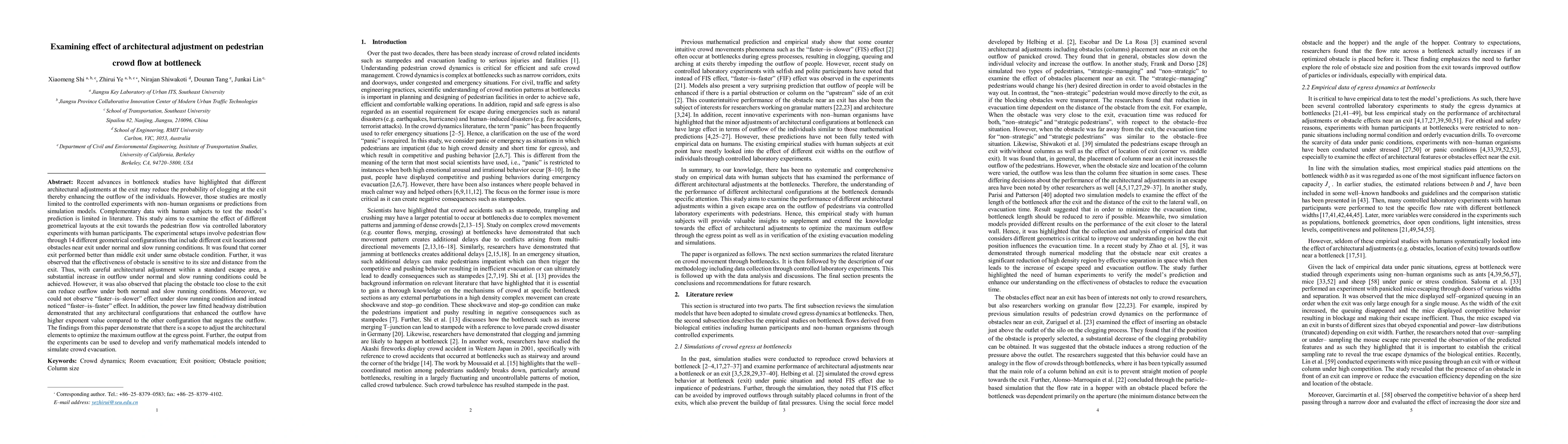 This study investigates the impact of various architectural adjustments at bottlenecks on pedestrian flow through controlled laboratory experiments with human participants. The results indicate that corner exits and optimal placement of obstacles near exits significantly enhance outflow, while placing obstacles too close to the exit can reduce it.