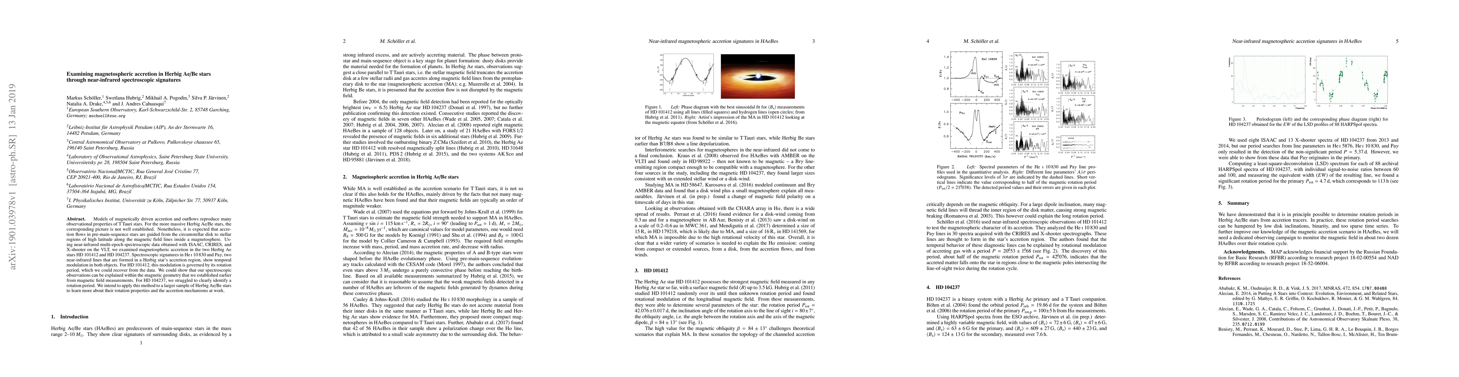 This paper investigates magnetospheric accretion in Herbig Ae/Be stars using near-infrared spectroscopy, focusing on HD101412 and HD104237. The study reveals temporal modulation in He I and Pa_gamma lines, indicating accretion processes guided by magnetic fields, with HD101412's rotation period identified, while HD104237's rotation period remains unclear.