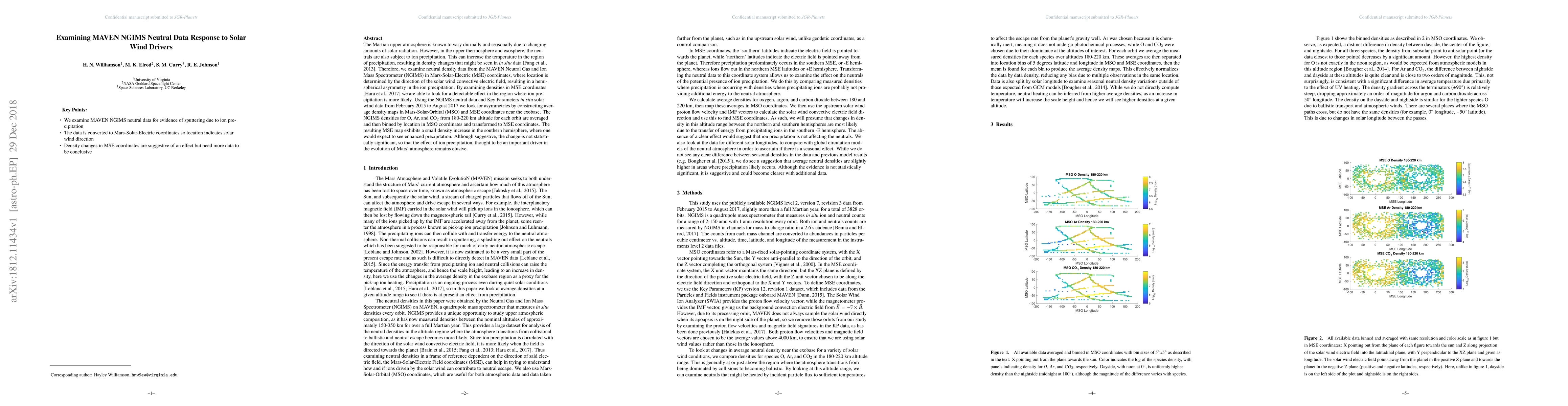 The Martian upper atmosphere is known to vary diurnally and seasonally due to changing amounts of solar radiation. However, in the upper thermosphere and exosphere, the neutrals are also subject to ion precipitation. This can increase the temperature in the region of precipitation, resulting in density changes that might be seen in in situ data (Fang et al. 2013). Therefore, we examine neutral density data from the MAVEN Neutral Gas and Ion Mass Spectrometer (NGIMS) in Mars-Solar-Electric (MSE) coordinates, where location is determined by the direction of the solar wind convective electric field, resulting in a hemispherical asymmetry in the ion precipitation. By examining densities in MSE coordinates (Hara et al. 2013) we are able to look for a detectable effect in the region where ion precipitation is more likely. Using the NGIMS neutral data and Key Parameters in situ solar wind data from February 2015 to August 2017 we look for asymmetries by constructing average density maps in Mars-Solar-Orbital (MSO) and MSE coordinates near the exobase. The NGIMS densities for O, Ar, and CO2 from 180-220 km altitude for each orbit are averaged and then binned by location in MSO coordinates and transformed to MSE coordinates. The resulting MSE map exhibits a small density increase in the southern hemisphere, where one would expect to see enhanced precipitation. Although suggestive, the change is not statistically significant, so that the effect of ion precipitation, thought to be an important driver in the evolution of Mars' atmosphere remains elusive.