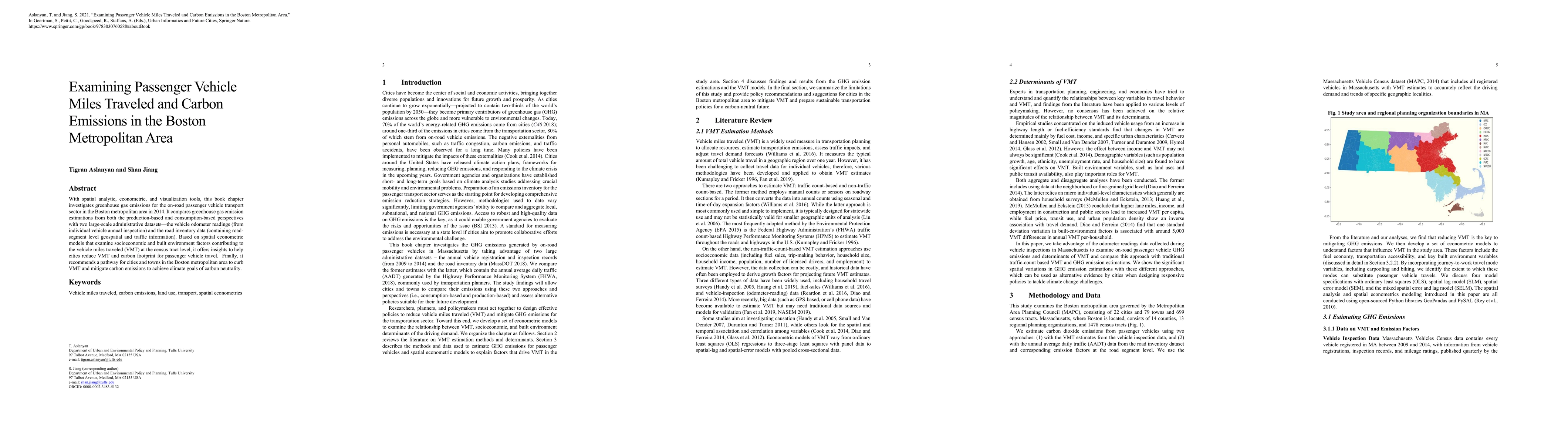 With spatial analytic, econometric, and visualization tools, this book chapter investigates greenhouse gas emissions for the on-road passenger vehicle transport sector in the Boston metropolitan area in 2014. It compares greenhouse gas emission estimations from both the production-based and consumption-based perspectives with two large-scale administrative datasets: the vehicle odometer readings from individual vehicle annual inspection, and the road inventory data containing road segment level geospatial and traffic information. Based on spatial econometric models that examine socioeconomic and built environment factors contributing to the vehicle miles traveled at the census tract level, it offers insights to help cities reduce VMT and carbon footprint for passenger vehicle travel. Finally, it recommends a pathway for cities and towns in the Boston metropolitan area to curb VMT and mitigate carbon emissions to achieve climate goals of carbon neutrality.